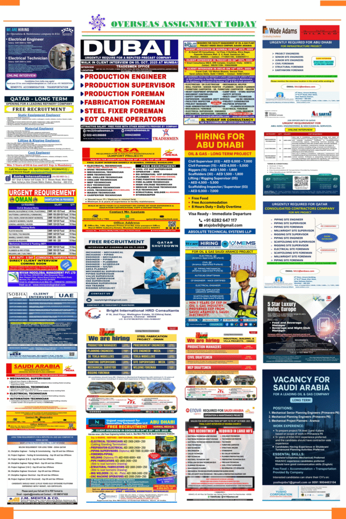 If you are looking for jobs in Gulf countries and Europe, there are wide range of type of job Assignment Abroad Times – 22 October 2025 roles available depending on the industry, the country, and the qualifications required. Here we summaries below the common job types in both the Gulf and Europe: