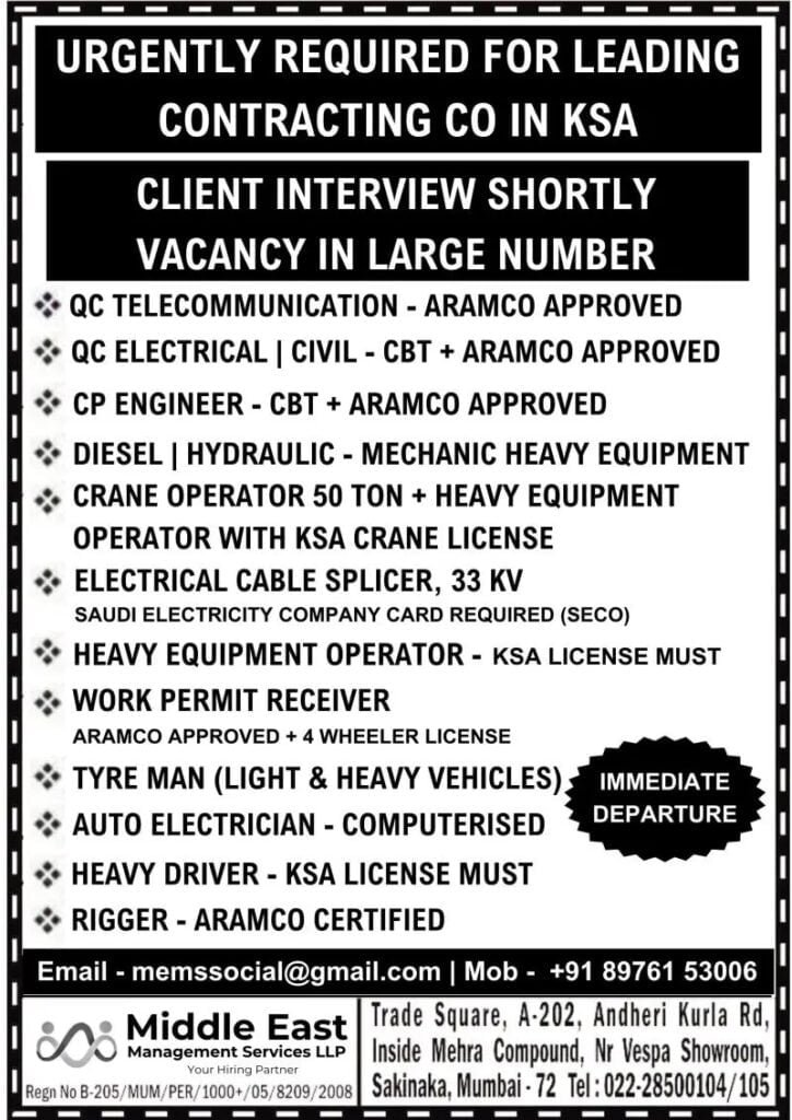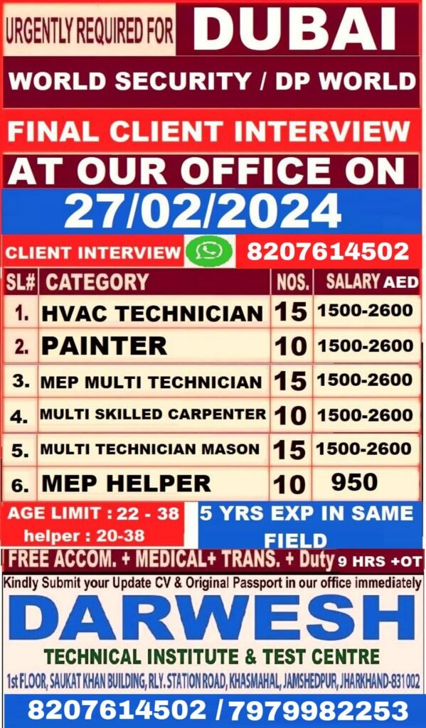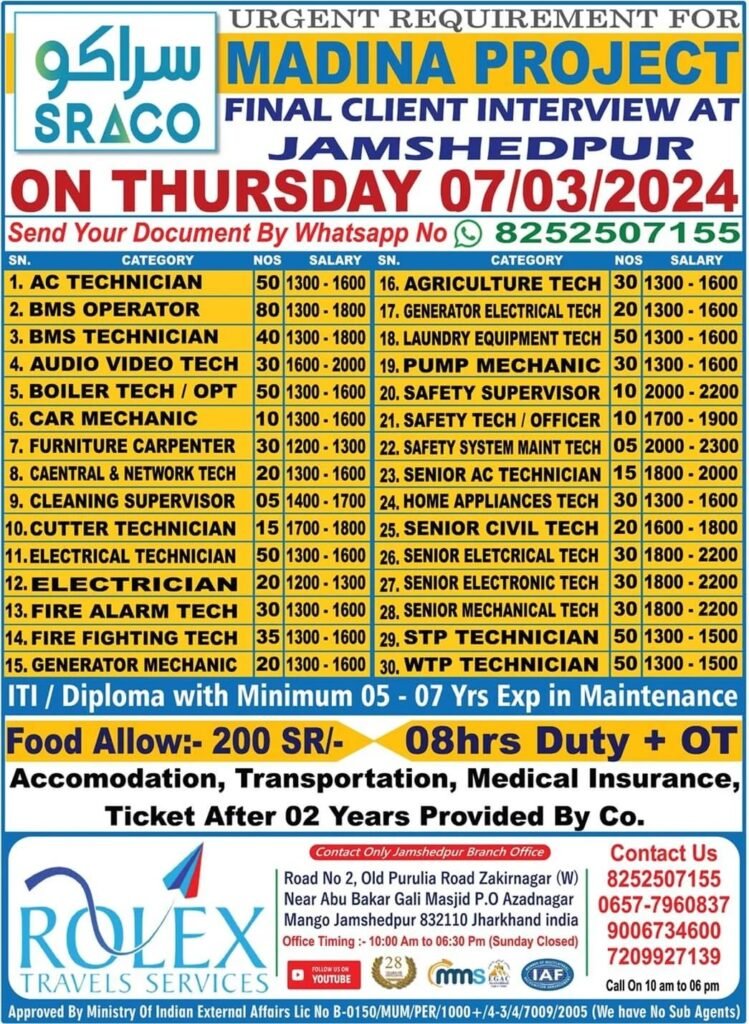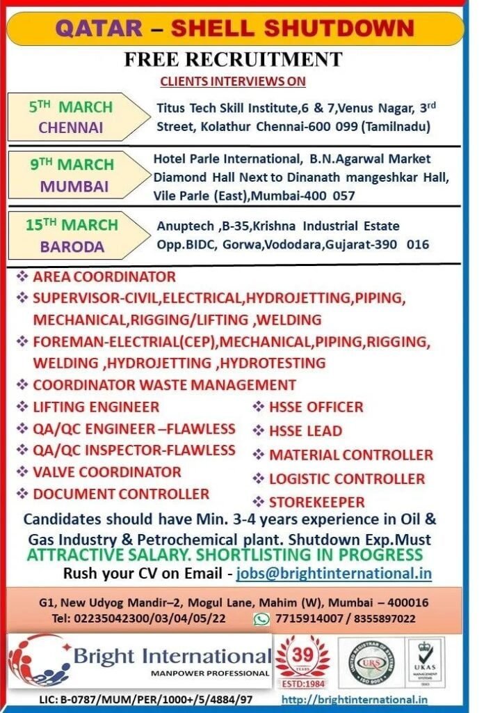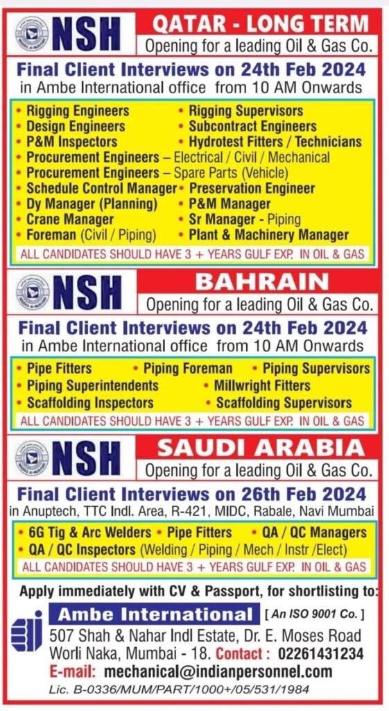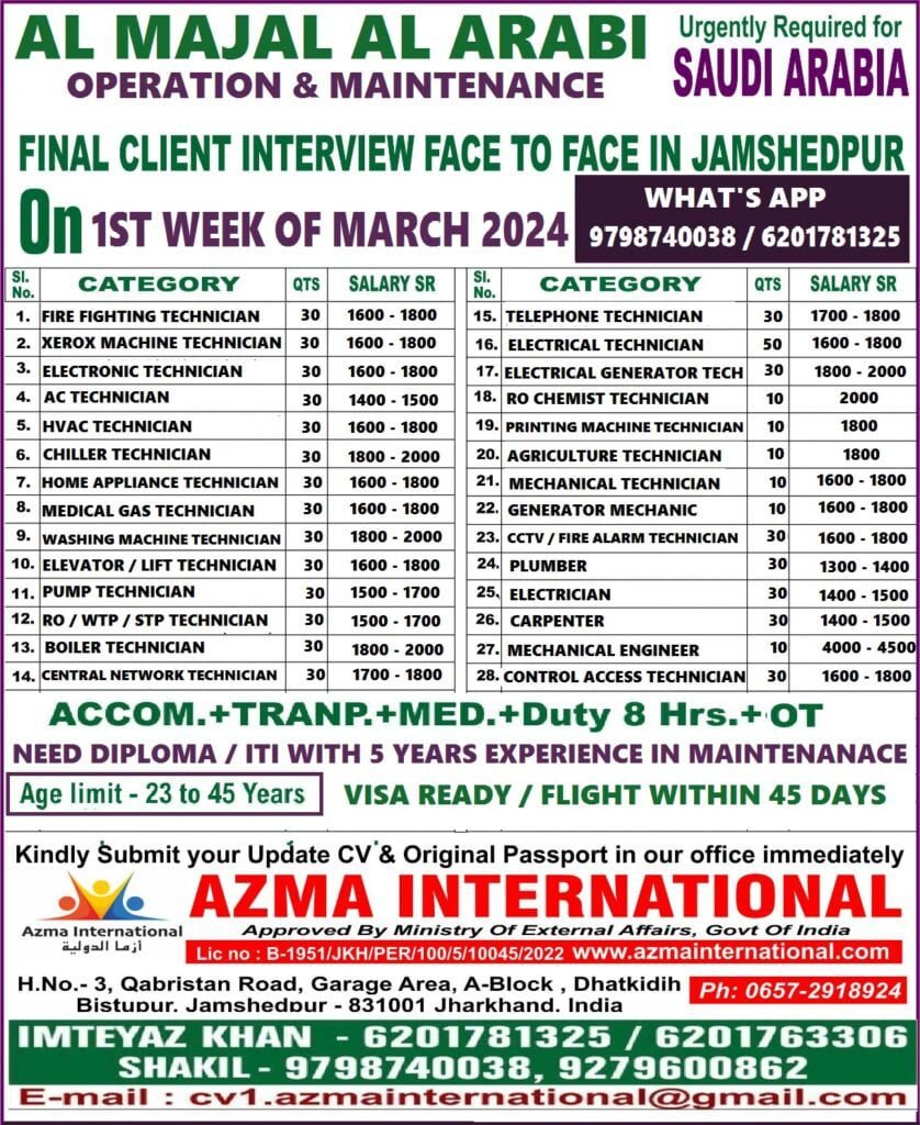 Urgently Hiring For A Leading Company Saudi ArabiaAssignment Abroad February 24, 2024 Read MoreURGENTLY REQUIRED FOR DUBAI WORLD SECURITY / DP WORLD FINAL CLIENT INTERVIEW AT OUR OFFICE ON 27/02/2024Assignment Abroad February 24, 2024 Read MoreFINAL CLIENT INTERVIEW OF AL MAJAL AL ARABI ( OPERATION & MAINTENANCE PROJECT ) SAUDI ARABIA AT AZMA INTERNATIONAL . JAMSHEDPUR ON 1ST WEEK OF MARCH 2024Assignment Abroad February 23, 2024 Read MoreSaudi Aramco Jobs 2024Assignment Abroad February 23, 2024 Read MoreSOMA Construction & Development Co., Ltd.SM PERTUMPTIONLASHEVELOPMENTAssignment Abroad February 22, 2024 Read MoreHiring For A Leading Construction Company In Ksa – Online InterviewAssignment Abroad February 22, 2024 Read MoreAl Naboodah AL NABOODAH CONSTRUCTION GROUP L.L.CAssignment Abroad February 22, 2024 Read MoreQatar,Bahrain & Saudi Jobs Long – Term ( Opening For A Leading Oil & Gas Company ) By Admin – February 22, 2024Assignment Abroad February 22, 2024 Read MoreQatar & Dubai Jobs – Furniture & Maintenance Division – Zoom InterviewAssignment Abroad February 22, 2024 Read MoreMadina Project Job Vacancy – Saudi ArabiaAssignment Abroad February 22, 2024 Read MoreADNOC Project Jobs in UAEAssignment Abroad February 22, 2024 Read MoreJob Vacancies For Construction Company in Saudi ArabiaAssignment Abroad February 22, 2024 Read MoreUrgent Requriment Saudi Arabia – Large VacancyAssignment Abroad February 22, 2024 Read MoreNMDC, NPCC Ofshore Jobs – UAEAssignment Abroad February 22, 2024 Read MoreQatar – Shell Shutdown JobsAssignment Abroad February 22, 2024 Read MoreZamil Steel Jobs Saudi ArabiaAssignment Abroad February 22, 2024 Read MoreTestAssignment Abroad February 22, 2024 Read MoreHiring For Garment Mfg Company in JordanAssignment Abroad February 21, 2024 Read MoreSaudi Arabia Jobs – Hirng For Almeer Saudi Technical Services CoAssignment Abroad February 21, 2024 Read MoreURGENTLY REQUIRED FOR DUBAI COMPANY FOR A LEADING ELECTROMECHANICAL 4 VERGER DELPORTE UAE LTDAssignment Abroad February 20, 2024 Read MoreSUPER QUICK SHIP REPAIRING LLC DUBAI CLIENT INTERVIEW ON 22/02/2024Assignment Abroad February 19, 2024 Read MoreUrgent Required for Shutdown (Bahrain NASS Engineering & Construction CompanyAssignment Abroad February 19, 2024 Read MoreSaudi Arabia Jobs – Printing & Packaging Company – CV SelectionAssignment Abroad February 19, 2024 Read MoreUrgent Hiring For Oman A Leading group Of Companies – Online InterviewAssignment Abroad February 19, 2024 Read MoreUrgent Hiring For Oman A Leading group Of Companies – Online InterviewAssignment Abroad February 19, 2024 Read MoreUrgent Job Opening For Saudi Arabia & DubaiAssignment Abroad February 19, 2024 Read MoreHiring For Animal Feed Mill Industry In Saudi ArabiaAssignment Abroad February 19, 2024 Read MoreUrgently Required for Leading & Contracting Company In SaudiAssignment Abroad February 19, 2024 Read MoreSaudi Arabia Jobs – Urban Design & Civil Infrastructure Project- Free RecruitmentAssignment Abroad February 19, 2024 Read MoreFree Recruitment For Largest Engineering Company In Oman – Cv SelectionAssignment Abroad February 19, 2024 Read MoreKNPC Kuwait Jobs (Maintenance Petrochemical Industry)Assignment Abroad February 19, 2024 Read MoreАbyat Jobs Saudi ArabiaAssignment Abroad February 19, 2024 Read MoreUrgent Requirement For Africa BeninAssignment Abroad February 18, 2024 Read MoreBest opportunity to work as a registered nurse for some of the best hospitals in SingaporeAssignment Abroad February 18, 2024 Read MoreOnshore & Offshore Jobs In Saudi Arabia – Housing & Catering RequirementAssignment Abroad February 18, 2024 Read MoreSaudi Arabia Jobs – Construction Company – CV SelectionAssignment Abroad February 18, 2024 Read MoreSaudi Arabia Jobs For A Reputed Tunnel / Metro Construction ProjectAssignment Abroad February 18, 2024 Read MoreHiring for Saudi Arabia (Fine Dine Indian Restaurant)Assignment Abroad February 18, 2024 Read MoreKuwait Jobs – Urgently Required For A Facility Management ProjectAssignment Abroad February 18, 2024 Read MoreSaudi Arabia Jobs – Maintenance,Repair & Operation JobsAssignment Abroad February 18, 2024 Read MoreLong Term Job Vacancies in Saudi ArabiaAssignment Abroad February 18, 2024 Read MoreAl Sharq Factory Careers & Jobs (2024)Assignment Abroad February 18, 2024 Read Morehiring For one of the Leading Facility Management Companies in KuwaitAssignment Abroad February 18, 2024 Read MoreAbu Dhabi Shutdown Jobs – Ega ProjectAssignment Abroad February 18, 2024 Read MorePASHA Construction “AZERBAIJAN”Assignment Abroad February 17, 2024 Read MoreJobs in OmanAssignment Abroad February 16, 2024 Read MoreURGENTLY REQUIRED FOR A STEEL PLANT COMPANY- SAUDI ARABIA.Assignment Abroad February 16, 2024 Read MoreQatar Job Vacancy For A Reputed Oil & Gas CompanyAssignment Abroad February 16, 2024 Read MoreJobs in Oman – Recruitment for a leading facilities management companyAssignment Abroad February 16, 2024 Read MoreJOB OPPORTUNITIES FOR LEADING OPERATION MAINTENANCE COMPANY IN KINGDOM OF SAUDI ARABIAAssignment Abroad February 14, 2024 Read More Previous1…4748495051…53Next