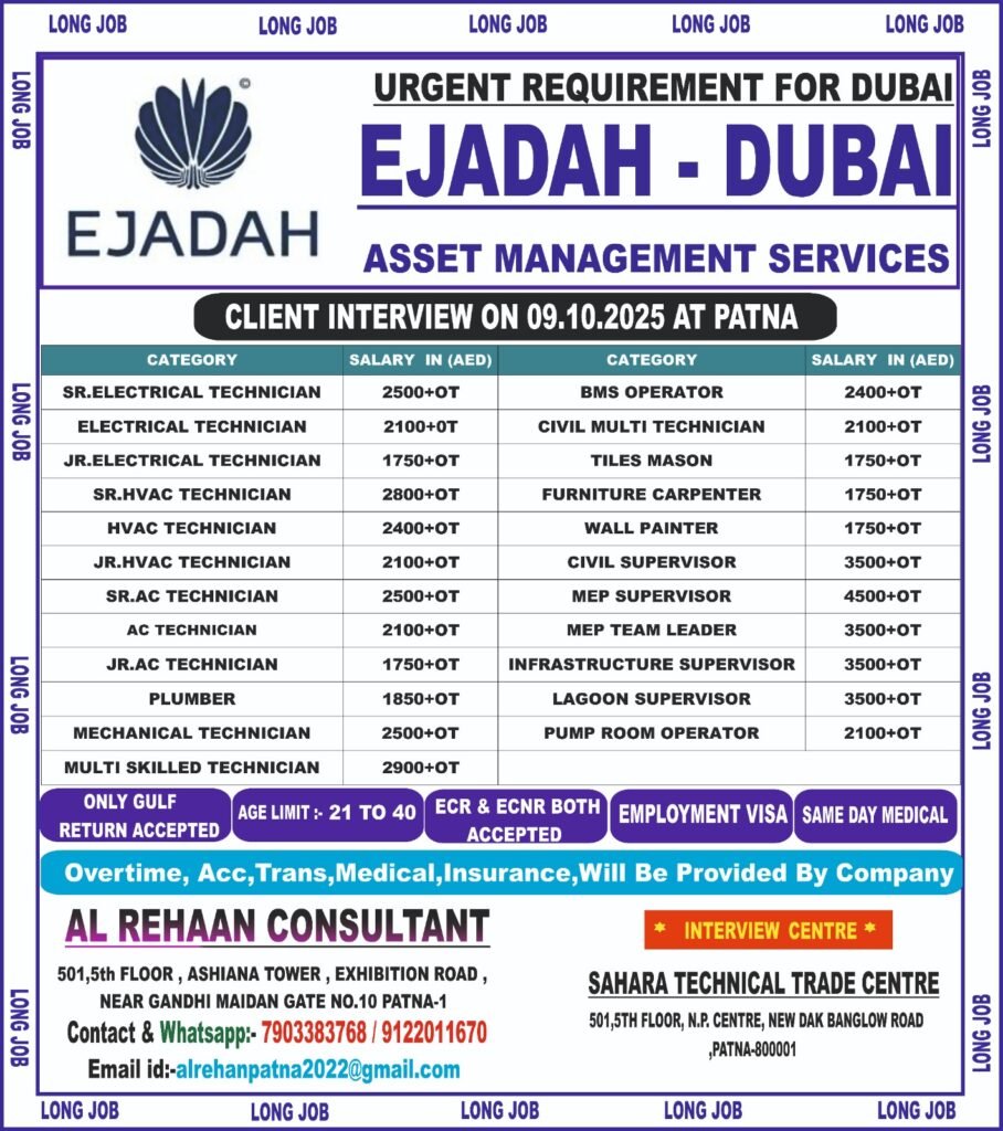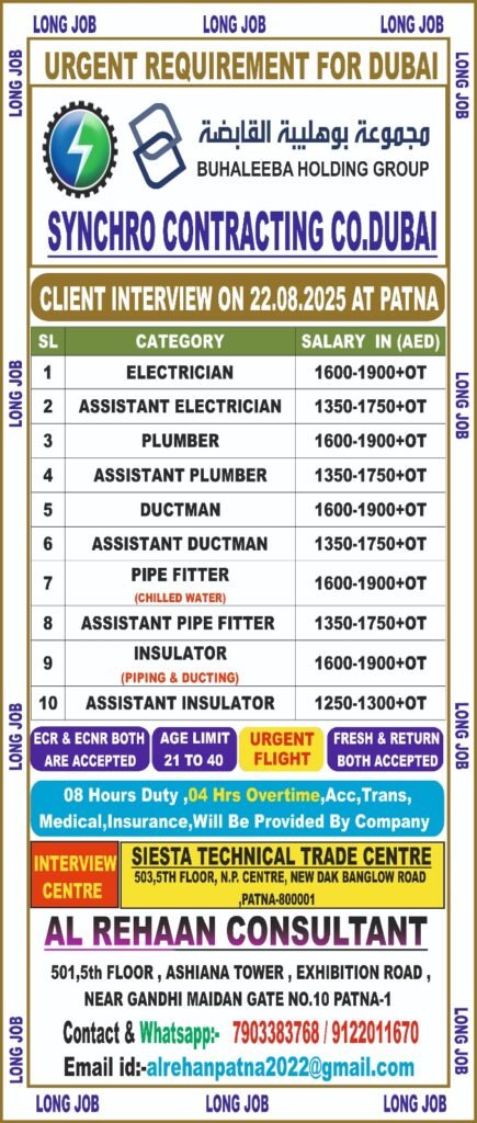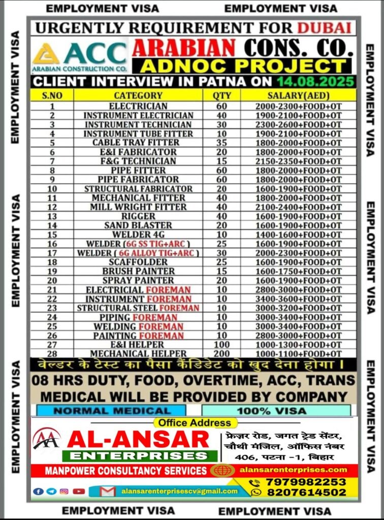 URGENTLY REQD. FOR REPUTED COMPANYAssignment Abroad October 8, 2025 Read MoreURGENTLY REQD. FOR REPUTED COMPANYAssignment Abroad October 8, 2025 Read MoreURGENTLY REQD. FOR REPUTED COMPANYAssignment Abroad October 8, 2025 Read MoreAssignment Abroad Times – 08th October 2025Assignment Abroad October 7, 2025 Read MoreURGENTLY REQD. FOR REPUTED COMPANYAssignment Abroad October 7, 2025 Read MoreURGENTLY REQD. FOR REPUTED COMPANYAssignment Abroad October 7, 2025 Read MoreURGENTLY REQD. FOR REPUTED COMPANYAssignment Abroad October 7, 2025 Read MoreURGENTLY REQD. FOR REPUTED COMPANYAssignment Abroad October 7, 2025 Read MoreURGENTLY REQD. FOR REPUTED COMPANYAssignment Abroad October 7, 2025 Read MoreURGENTLY REQD. FOR REPUTED COMPANYAssignment Abroad October 6, 2025 Read MoreURGENTLY REQD. FOR REPUTED COMPANYAssignment Abroad October 6, 2025 Read MoreURGENTLY REQD. FOR REPUTED COMPANYAssignment Abroad October 3, 2025 Read MoreURGENTLY REQD. FOR REPUTED COMPANYAssignment Abroad October 3, 2025 Read MoreUrgent Requirement for EJADAH CO DUBAI COMPANY – Client Interview At PATNA on 09th OCTOBER 2025Assignment Abroad October 2, 2025 Read MoreUrgent Requirement for MIA OIL & GAS COMPANY SAUDI ARABIA – Client Interview At PATNA on 09th OCTOBER 2025Assignment Abroad October 2, 2025 Read MoreWALKIN DIRECT CLIENT INTERVIEW @baroda 8th octoberAssignment Abroad October 1, 2025 Read MoreURGENTLY REQD. FOR REPUTED COMPANYAssignment Abroad October 1, 2025 Read MoreURGENTLY REQD. FOR REPUTED COMPANYAssignment Abroad October 1, 2025 Read Morewalkin direct client interview @ vadodara 8th october 2025Assignment Abroad October 1, 2025 Read MoreWALKIN DIRECT CLIENT INTERVIEW @PATNAAssignment Abroad September 30, 2025 Read MoreWALKIN DIRECT CLIENT INTERVIEW @ SURATAssignment Abroad September 30, 2025 Read MoreWALKIN DIRECT CLIENT INTERVIEW @SURATAssignment Abroad September 30, 2025 Read MoreURGENTLY REQD. FOR REPUTED COMPANYAssignment Abroad September 29, 2025 Read MoreURGENTLY REQD. FOR REPUTED COMPANYAssignment Abroad September 29, 2025 Read MoreURGENTLY REQD. FOR REPUTED COMPANYAssignment Abroad September 29, 2025 Read MoreURGENTLY REQD. FOR REPUTED COMPANYAssignment Abroad September 29, 2025 Read MoreOverseas Assignment Today 28-September-2025Assignment Abroad September 28, 2025 Read MoreUrgent Requirement for SYNCHRO CONTRACTING COMPANY DUBAI – Client Interview At PATNA on 22th AUGUST 2025Assignment Abroad August 17, 2025 Read MoreWANTED HOUSEMAID -MALAYSIAAssignment Abroad August 16, 2025 Read MoreWANTED TAILOR -MALAYSIAAssignment Abroad August 16, 2025 Read MoreImmediate Hiring – 5-Axis Mill CAM Programmers!Assignment Abroad August 16, 2025 Read MoreWanted-Saudi Arabia Preferred: Aramco certified / Gulf return candidatesAssignment Abroad August 16, 2025 Read MoreURGENT HIRING – SALES PERSON MALAYSIAAssignment Abroad August 16, 2025 Read MoreURGENT HIRING – GABON, AFRICA 🌍Assignment Abroad August 16, 2025 Read MoreTRADITIONAL BARBERAssignment Abroad August 15, 2025 Read MoreURGENTLY REQUIRED FOR AL YAMAMA COMPANY KSAAssignment Abroad August 14, 2025 Read MoreURGENTLY REQUIRED FOR AL YAMAMA COMPANY KSAAssignment Abroad August 14, 2025 Read MoreURGENTLY REQUIRED FOR AL YAMAMA COMPANY KSAAssignment Abroad August 14, 2025 Read MoreURGENTLY REQUIRED FOR AL YAMAMA COMPANY KSAAssignment Abroad August 14, 2025 Read MoreURGENTLY REQUIRED FOR AL YAMAMA COMPANY KSAAssignment Abroad August 14, 2025 Read MoreURGENTLY REQUIRED FOR AL YAMAMA COMPANY KSAAssignment Abroad August 14, 2025 Read MoreURGENTLY REQUIRED FOR AL YAMAMA COMPANY KSAAssignment Abroad August 14, 2025 Read MoreURGENTLY REQUIRED FOR AL YAMAMA COMPANY KSAAssignment Abroad August 14, 2025 Read MoreURGENT REQUIREMENT FOR BIKE RIDERS ::-:: FOOD DELIVERY DRIVER ::-:: TALABAT, NOON, PORTER, SMILE, SHARJAH CORP ::-:: EMPLOYMENT VISA ::-:: PEOPLEFEED HRAssignment Abroad August 13, 2025 Read MoreUrgent Job Vacancies in Dubai for ADNOC Project – Client Interview in Patna on 14 August 2025Assignment Abroad August 12, 2025 Read MoreUrgent required for reputed company ksaAssignment Abroad August 12, 2025 Read MoreUrgent required for reputed company ksaAssignment Abroad August 12, 2025 Read MoreUrgent required for reputed company ksaAssignment Abroad August 12, 2025 Read MoreURGENTLY REQUIRED FOR AL YAMAMA COMPANY KSAAssignment Abroad August 12, 2025 Read MoreURGENTLY REQUIRED FOR AL YAMAMA COMPANY KSAAssignment Abroad August 12, 2025 Read More Previous1…45678…53Next