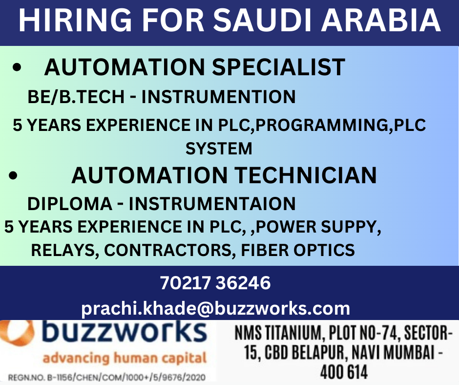 1. Automation Specialist – BE/B.Tech – Instrumentation