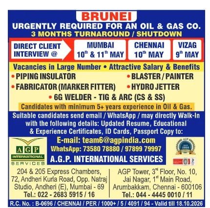 Gulf Job vacancyBrunei Jobs – Urgently Required For An Oil & Gas Co. 3 – Months Turnaround / ShutdownBy Assignment AbroadPublished on: April 28, 2024 ---Advertisement---E-mail: Team6@agpindia.comWhatsapp: 73580 78880/97899 79997Agp InternationalRelated Posts:Assignment Abroad Times – 14th January 2026Assignment Abroad Times 10th January 2026Assignment Abroad Times – 31st December 2025Urgent Requirement for DUBAI M/S EMIRATES COMPANY –…Urgent Requirement for DUBAI M/S FOURTH DIMENSION…Urgent Requirement for DUBAI M/S ALEMCO COMPANY –… Assignment Abroad Assignment Abroad times Gulf job vacancy