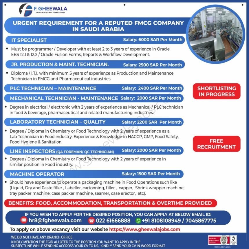 Urgent Requirement For A Reputed Fmcg Company In Saudi Arabia