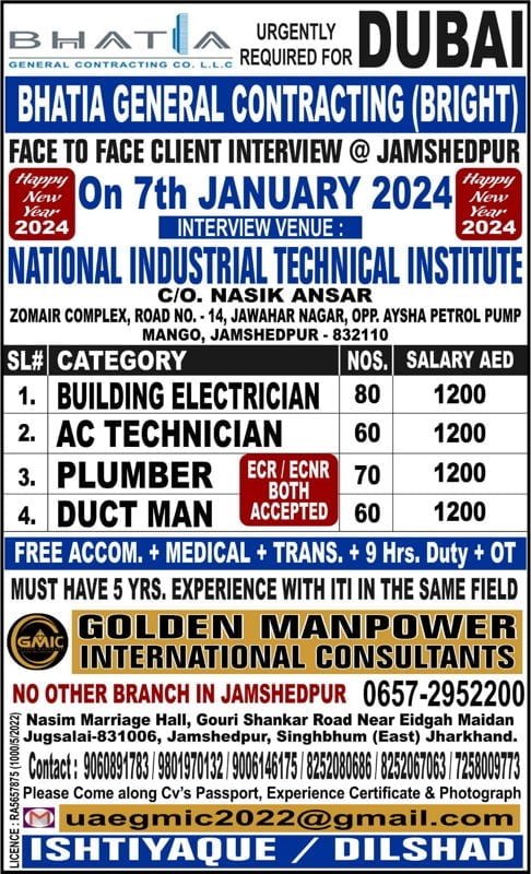 Jobs In Dubai, UAE – Bhatia General Contracting Co. Llc