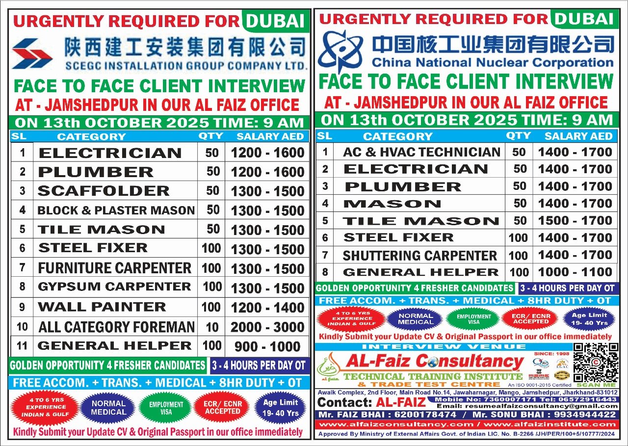 Urgent Requirement for DUBAI CHINA NNC & SCEGC IG COMPANY – Client Interview At Jamshedpur on 13 OCTOBER 2025