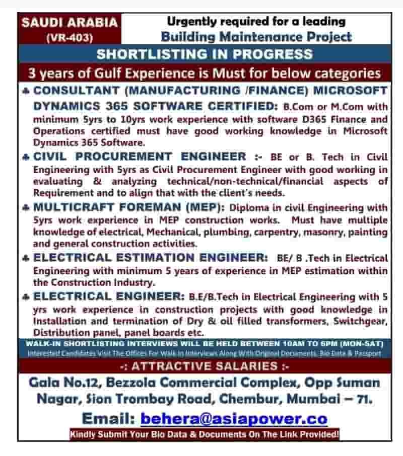 Maintenance Project Job Vacancy in Saudi Arabia