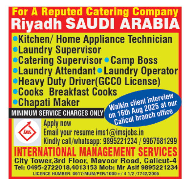 Job Opportunities in Saudi Arabia: Walk-in Interviews in Calicut on 16th August 2025