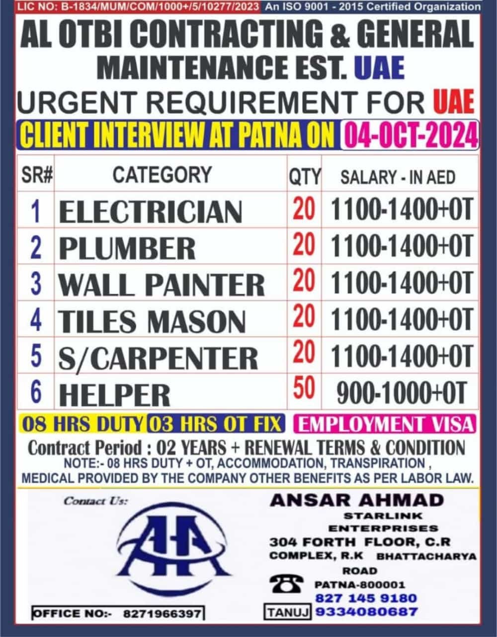 Gulf Job vacancyELECTRICIAN,PLUMBERBy Assignment AbroadPublished on: October 1, 2024 ---Advertisement--- STARLINK INTERPRISES 9334080687Related Posts:Bin Sultan Group – KSA (By Soundlines Group)Overseas Assignment: Mauritius Job Openings –…Overseas Assignment: NSH Qatar 9-Month Project –…Overseas Assignment – Russia Construction Jobs |…Overseas Assignment – Qatar Ministry of Education…Overseas Assignment 23-October-2025 Gulf job vacancy