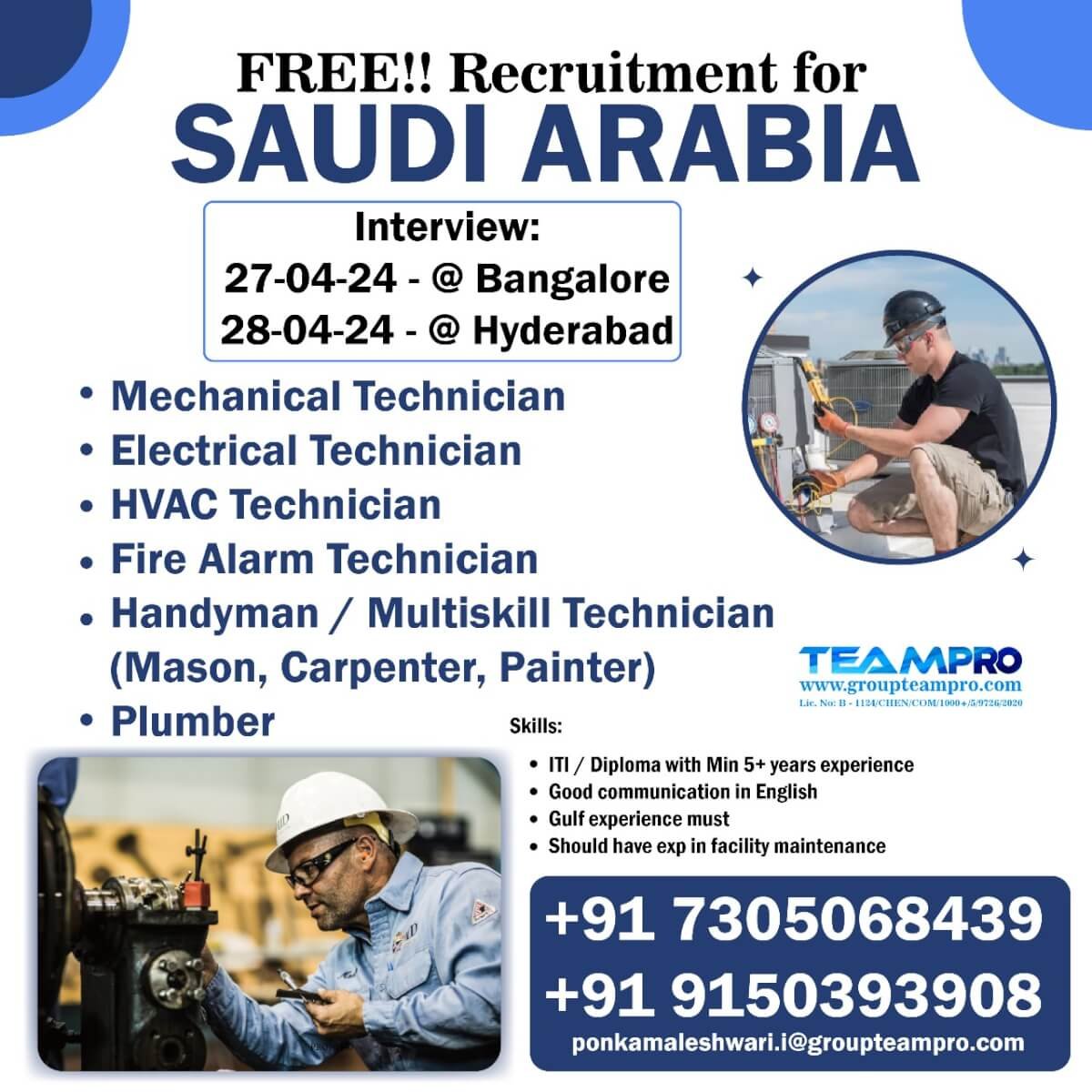 Gulf Job vacancyFree Recruitment For Saudi Arabia-TechnicianBy Assignment AbroadPublished on: April 22, 2024 ---Advertisement---Should have exp in facility maintenanceContact to : 9150393908Related Posts:Assignment Abroad Times 10th January 2026Assignment Abroad Times – 31st December 2025Urgent Requirement for DUBAI M/S EMIRATES COMPANY –…Urgent Requirement for DUBAI M/S FOURTH DIMENSION…Urgent Requirement for DUBAI M/S ALEMCO COMPANY –…Overseas Assignment Abroad Times 23-November-2025 Assignment Abroad times