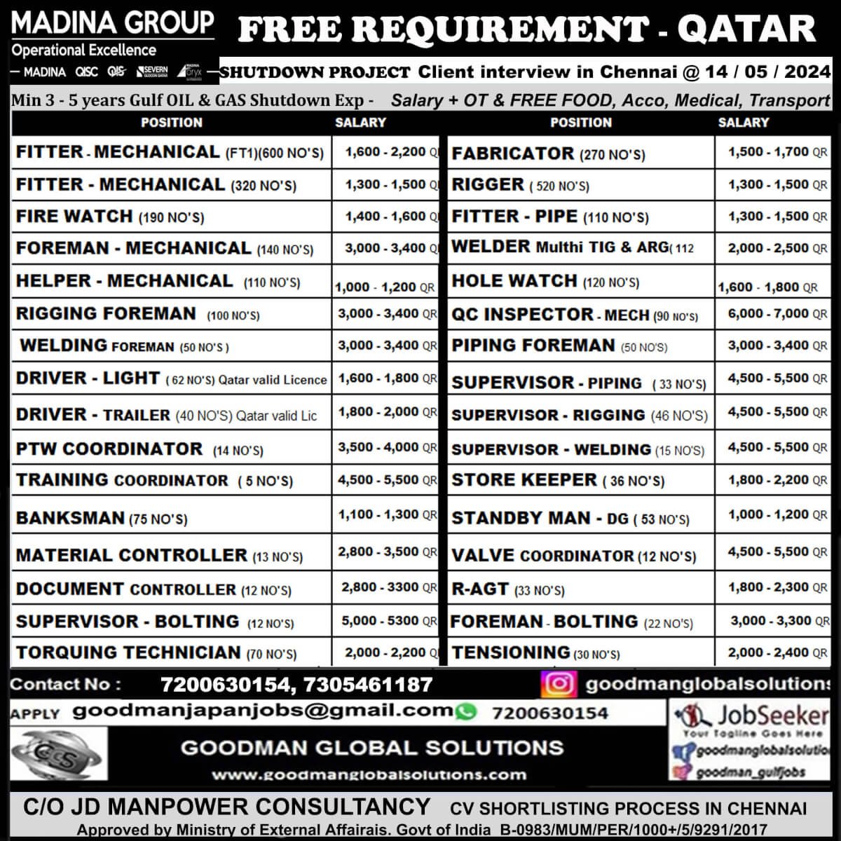 FREE REQUIREMENT – QATAR – MADINA GROUP OIL & GAS – SHUTDOWN PROJECT Client interview in Chennai @ 14 / 05 / 2024