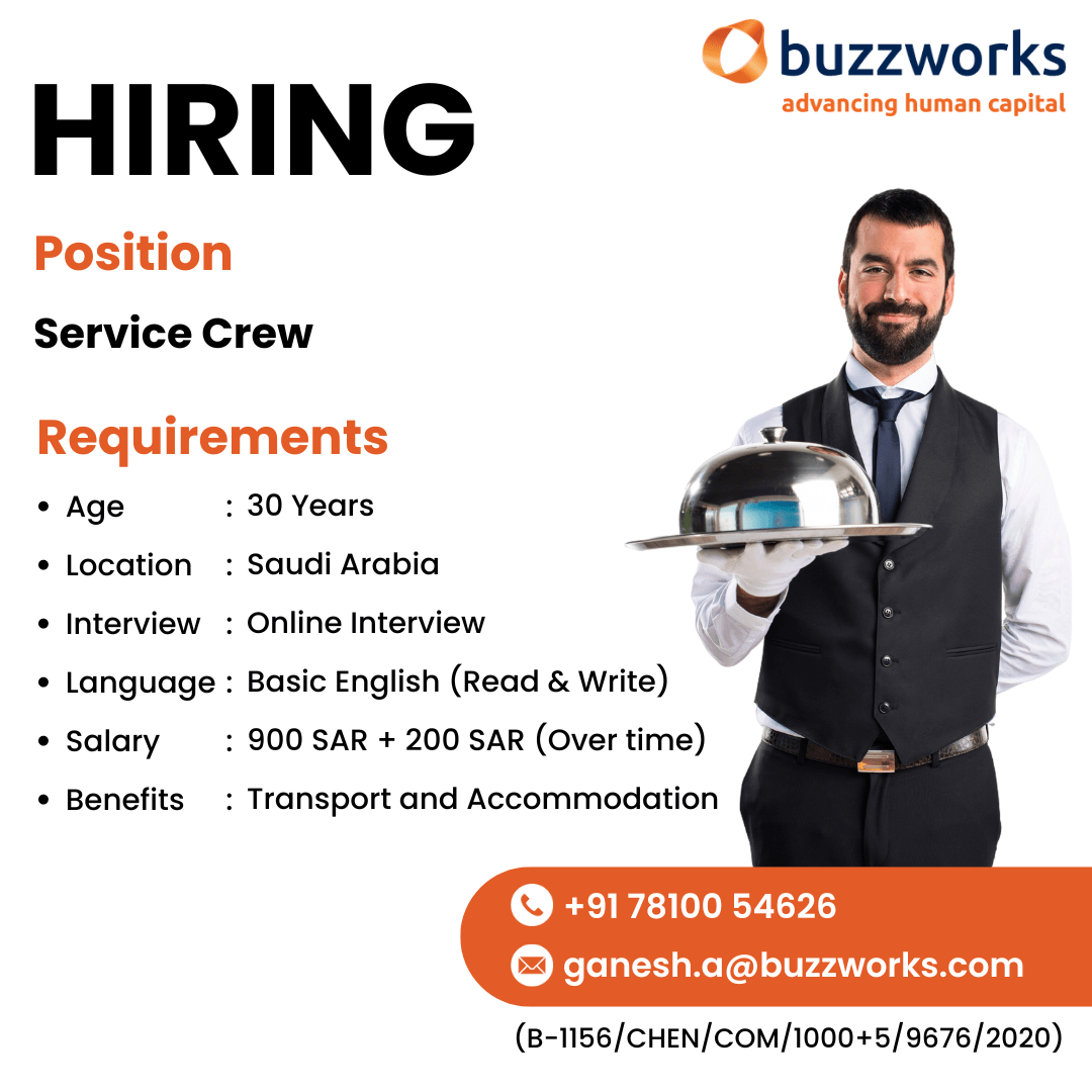 Position – Service Crew (Waiters Normal English Spoken Candidates)