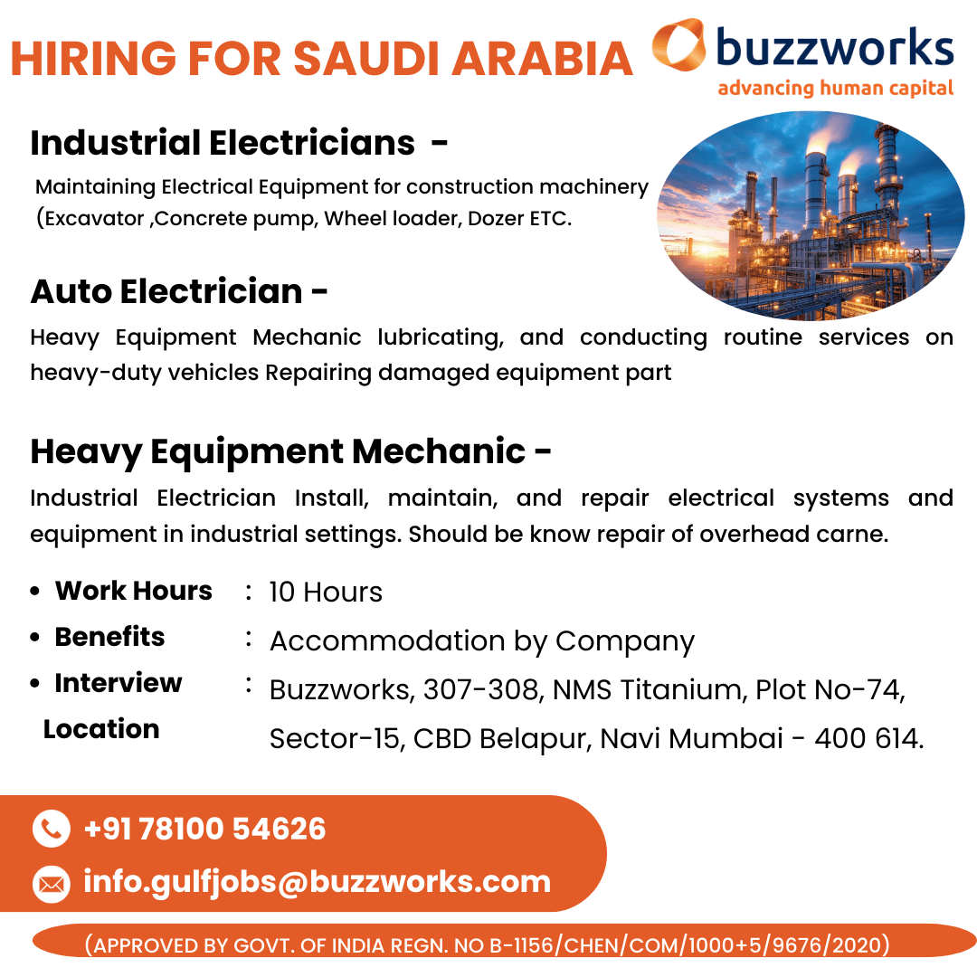 Auto Electrician Heavy Equipment -2000 – 2200 SAR