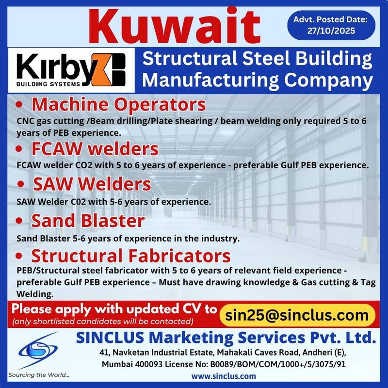 - Machine Operators, FCAW/SAW Welders, Sand Blasters, Structural Fabricators
