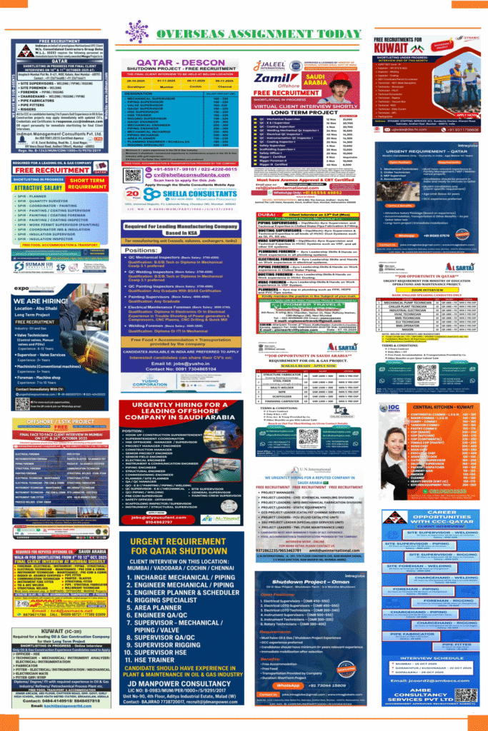 The Assignment Abroad Times is a weekly publication dedicated to job seekers aspiring to work abroad. It includes vacancies from reputed employers and recruitment agencies for countries such as Saudi Arabia, UAE, Qatar, Oman, Kuwait, Bahrain, and others.