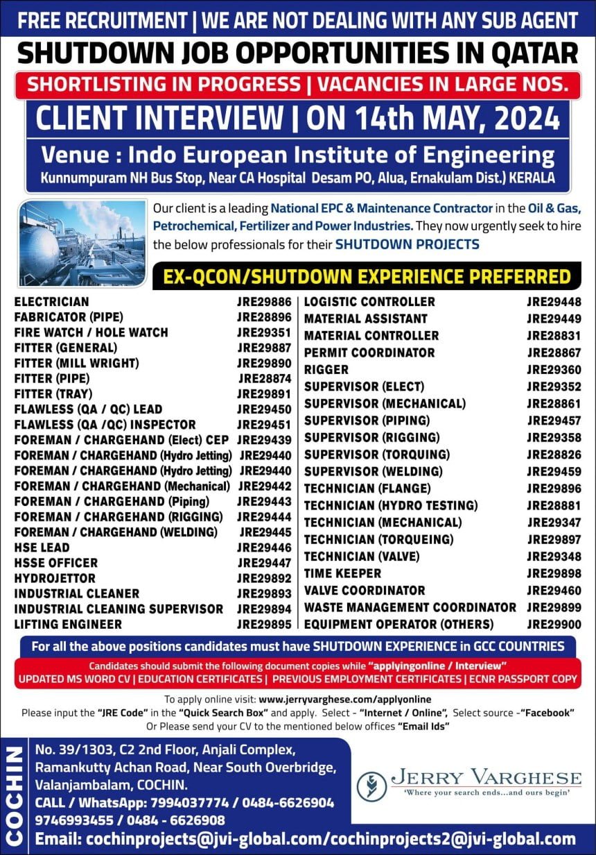 Email CV To cochinprojects@jvi-global.com/cochinprojects2@jvi-global.com
