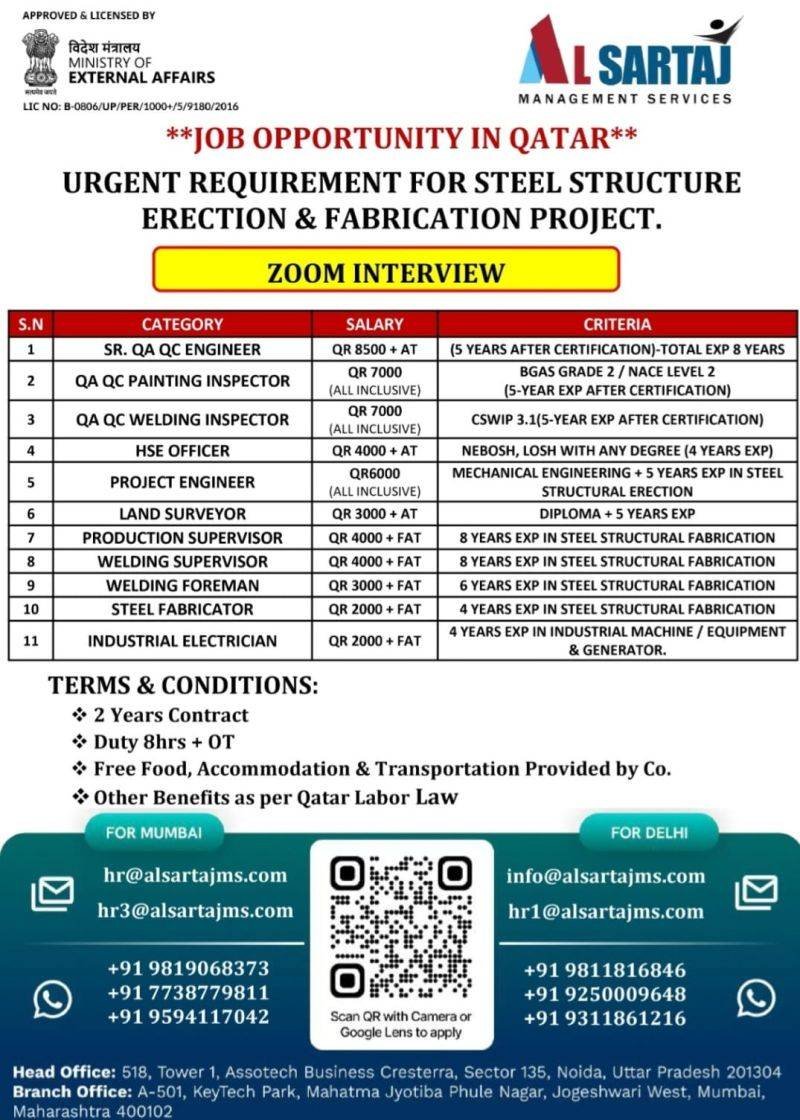 💰 Salary: QR 2000 – QR 8500 + Food, Accommodation & Transport