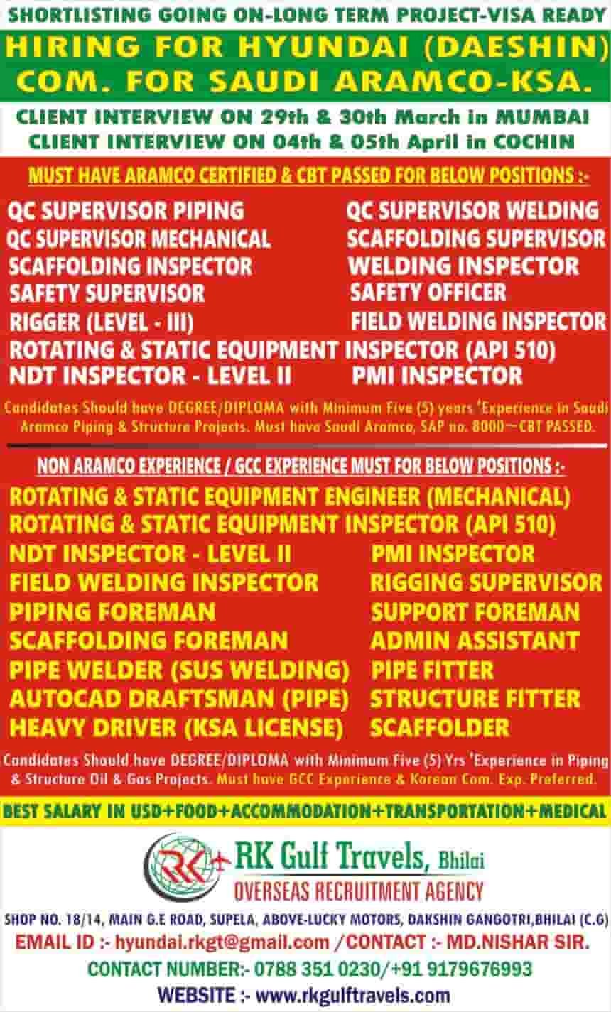Hiring For Hyundai (Daeshin) company For Saudi Aramco