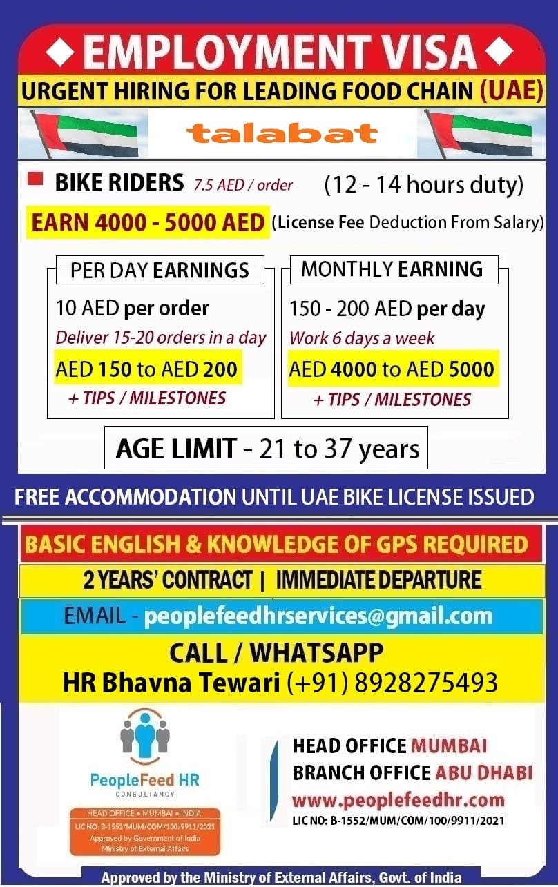 URGENT HIRING FOR TALABAT (UAE) ::-:: LICENSE FEE DEDUCTION FROM SALARY ::-:: EMPLOYMENT VISA