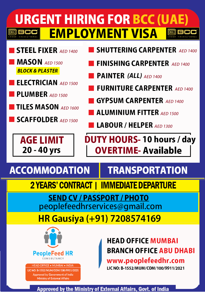 URGENT REQUIREMENT FOR BCC CONSTRUCTION COMPANY (UAE) ::-:: EMPLOYMENT VISA ::-:: DIRECT SELECTIONS ::-:: IMMEDIATE FLIGHT TICKET