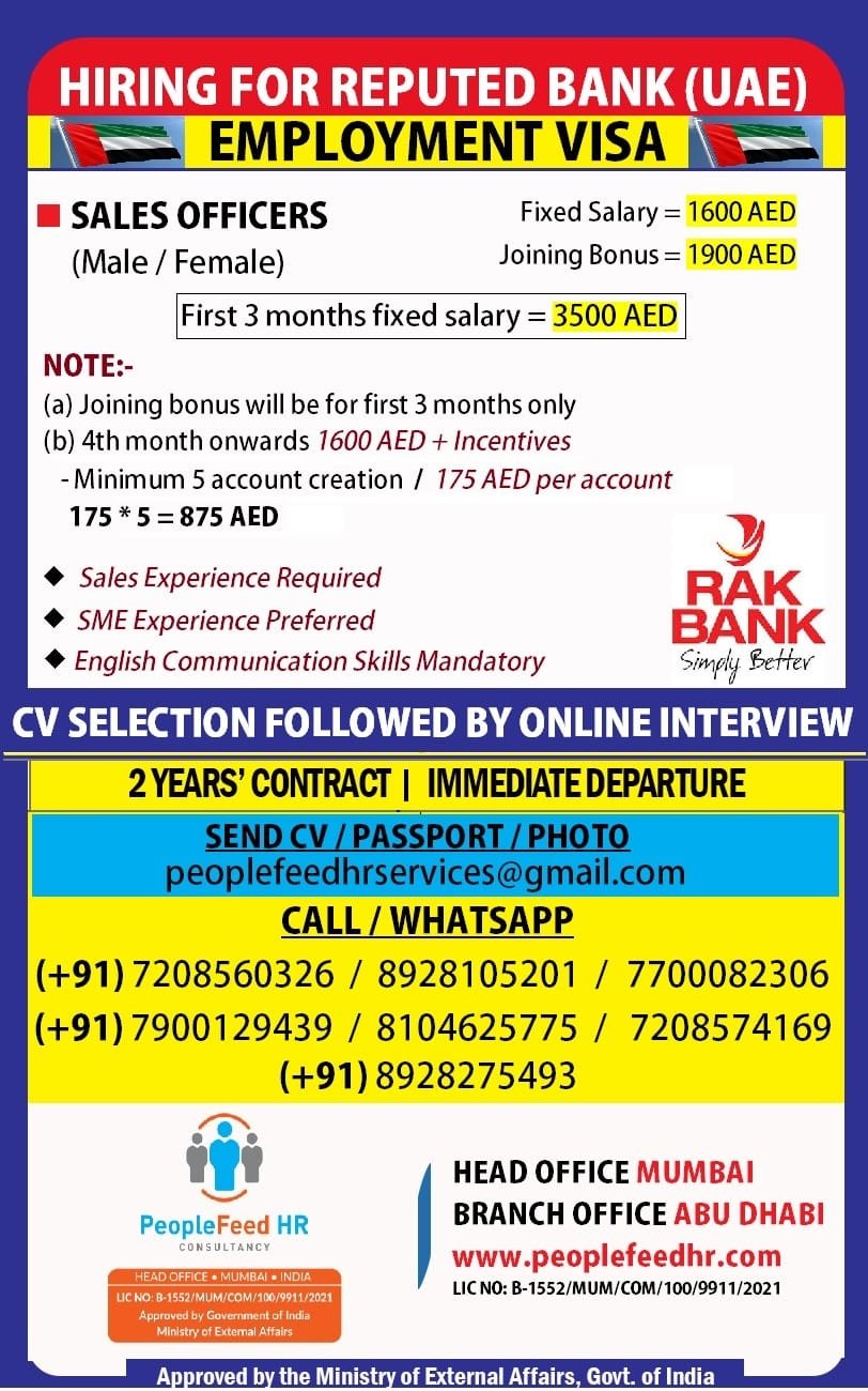 URGENT HIRING GROWTH / SALES OFFICERS ::-:: RAK BANK ::-:: EMPLOYMENT VISA ::-:: UAE