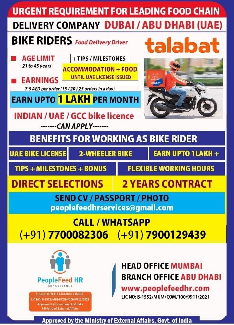 URGENT REQUIREMENT FOR TALABAT ::-:: BIKE RIDERS ::-:: FOOD DELIVERY DRIVERS ::-:: DIRECT SELECTIONS ::-:: UAE