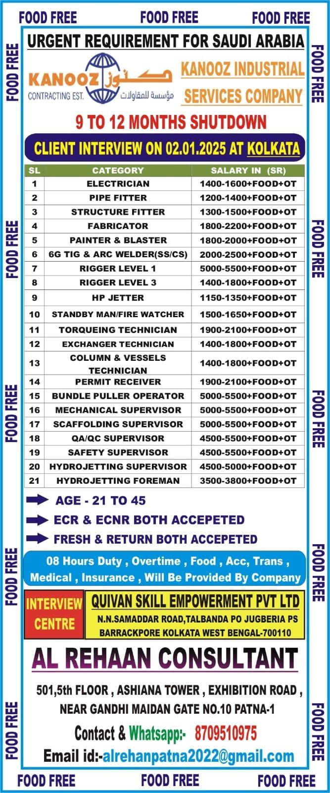 Urgent Requirement for KNOOZ CONSTRUCTION COMPANY SAUDI ARABIA – Client Interview At KOLKATA on 02 JANUARY 2025