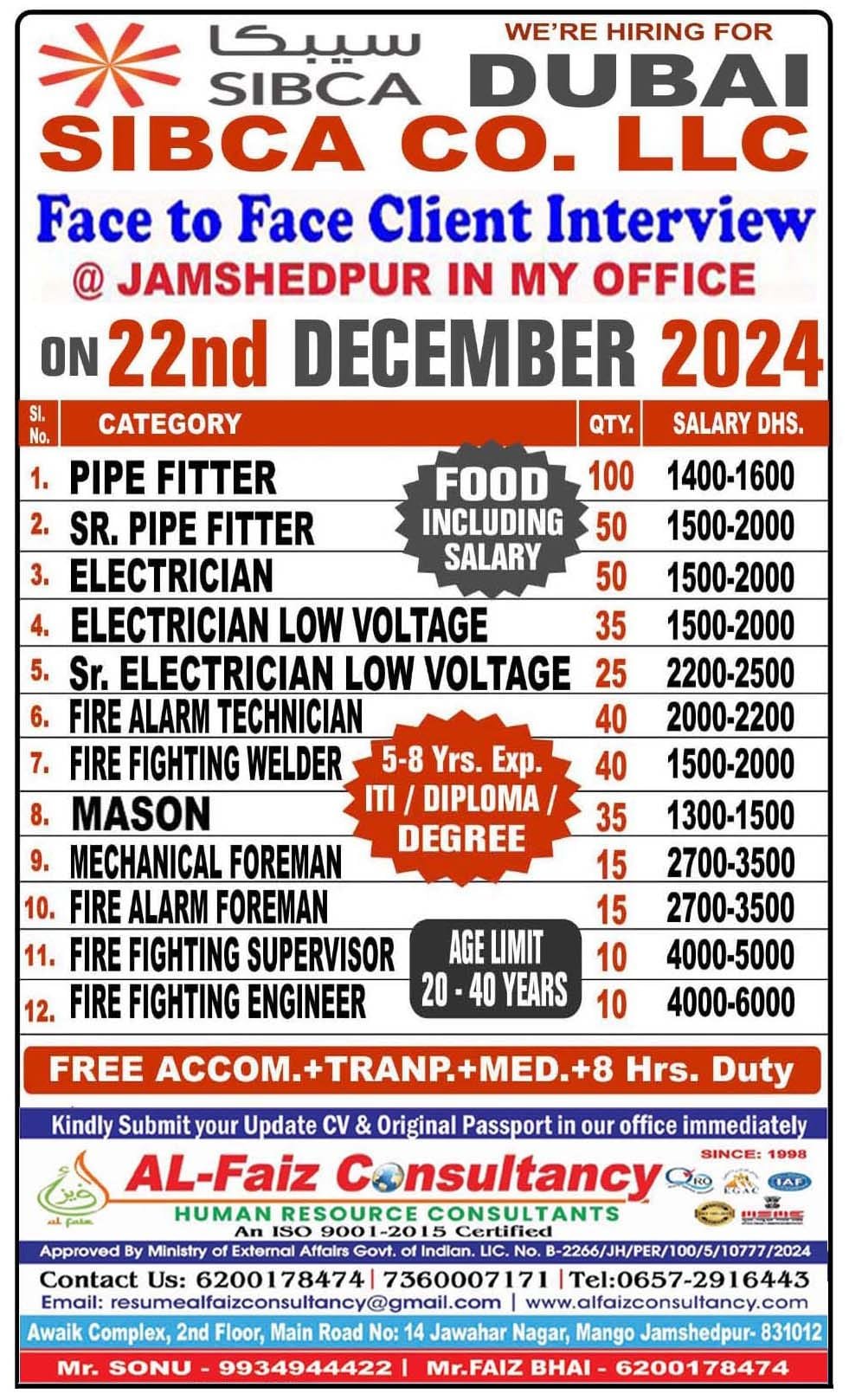 Urgent Requirement for DUBAI SIBCA COMPANY – Client Interview At Jamshedpur on 22 DECEMBER 2024