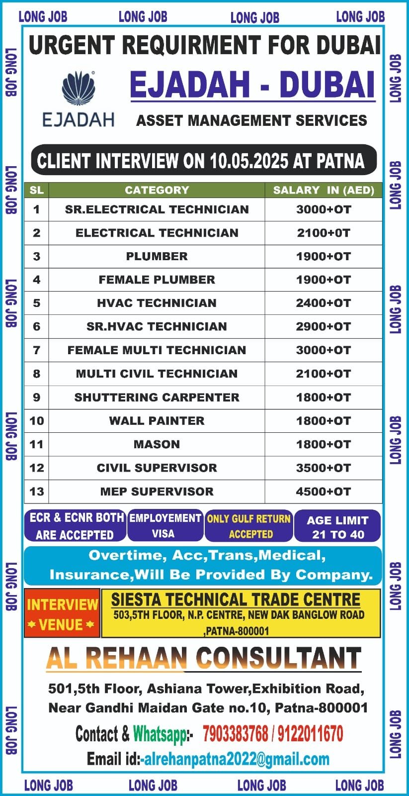 Urgent Requirement for EJADAH DUBAI COMPANY – Client Interview At Patna on 10 MAY 2025
