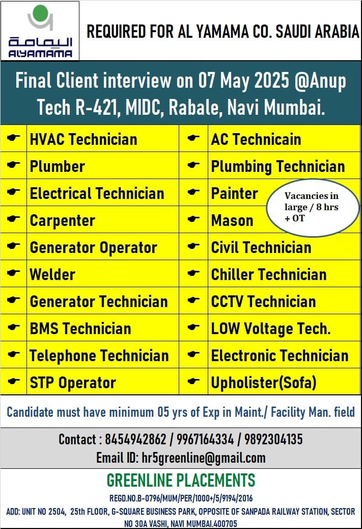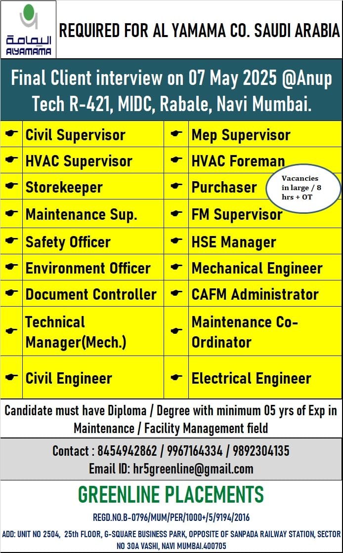 URGENTLY REQUIRED FOR AL YAMAMA COMPANY KSA