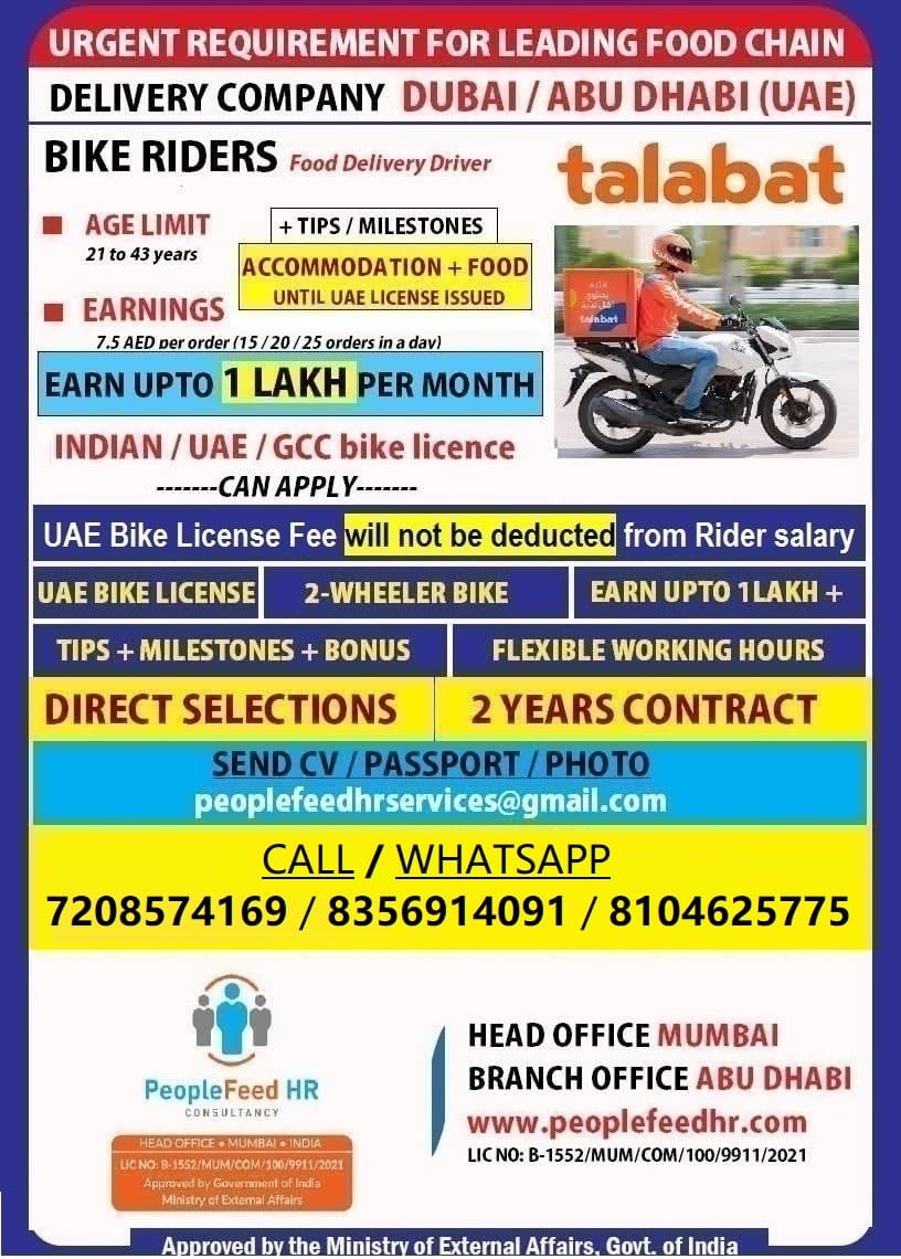 URGENT REQUIREMENT FOR TALABAT FOOD DELIVERY COMPANY ::-:: UAE ::-:: DIRECT SELECTIONS