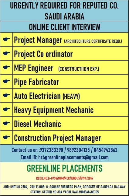 URGENT REQUIREMENT FOR REPUTED ELECTROMECHANICAL COMPANY ::-:: QATAR ::-:: VIDEO CALL INTERVIEW