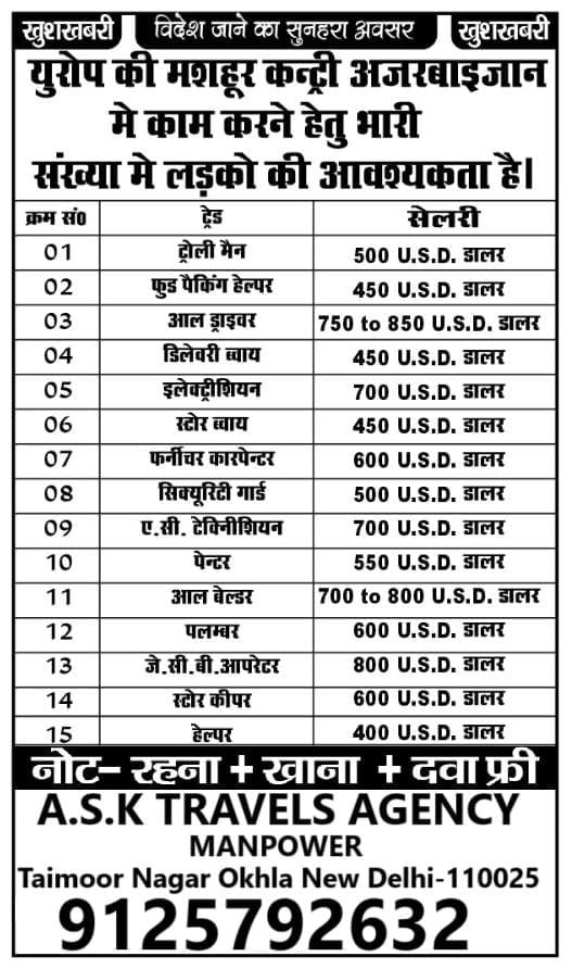 युरोप की मशहूर कन्ट्री अजरबाइजान मे काम करने हेतु भारी संख्या मे लड़को की आवश्यकता है।