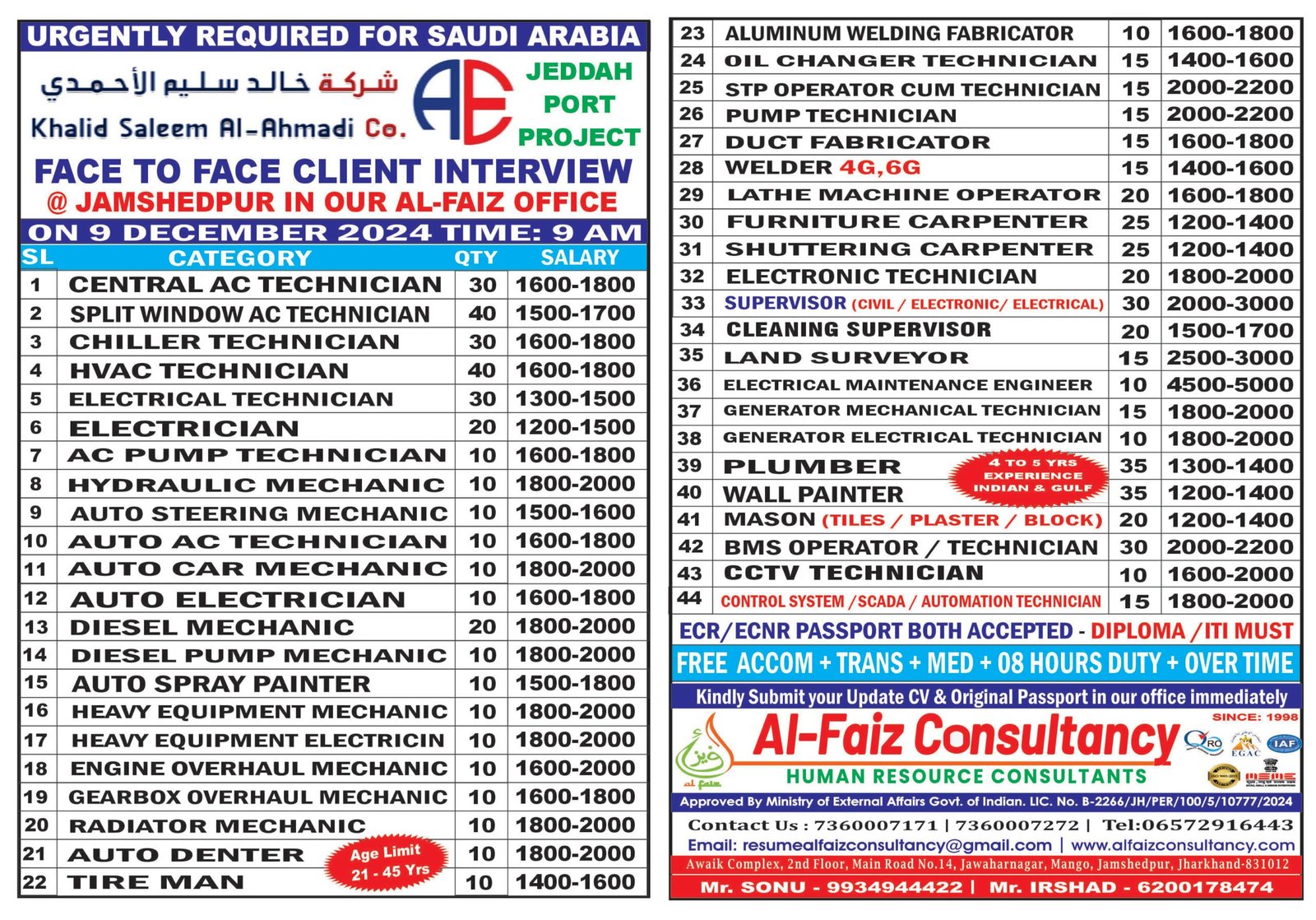 Urgent Requirement for SAUDI ARABIA KHALID SALEEM AL AHMADI COMPANY – Client Interview At Jamshedpur on 9 DECEMBER 2024