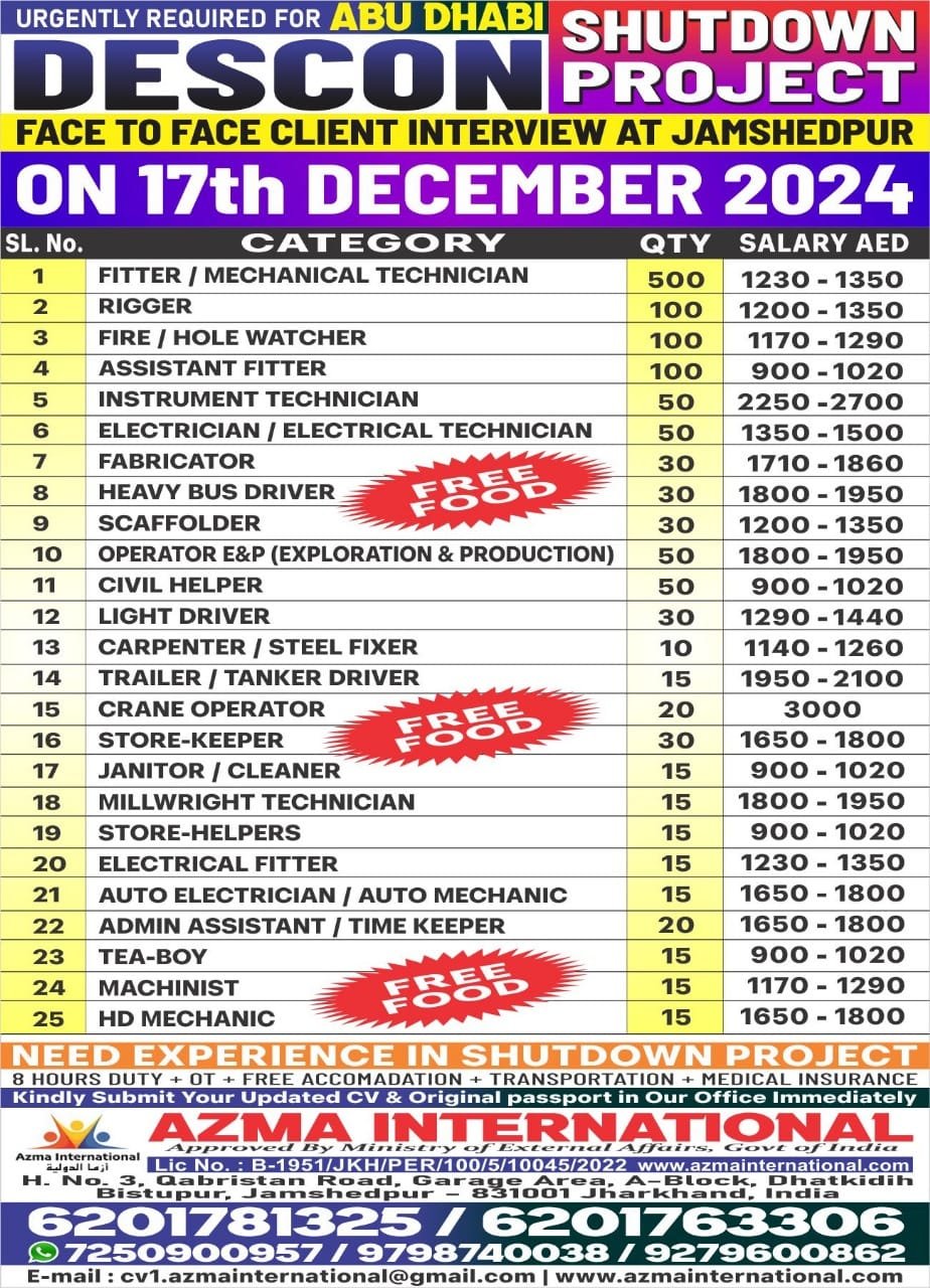 Urgent Requirement for SAUDI ARABIA AL DEYABI GROUP OF COMPANY – Client Interview At Jamshedpur on 4 DECEMBER 2024