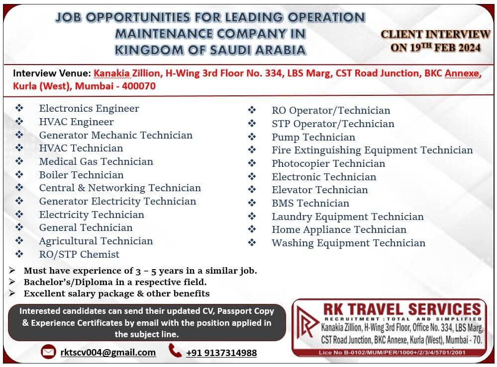JOB OPPORTUNITIES FOR LEADING OPERATION MAINTENANCE COMPANY IN KINGDOM OF SAUDI ARABIA