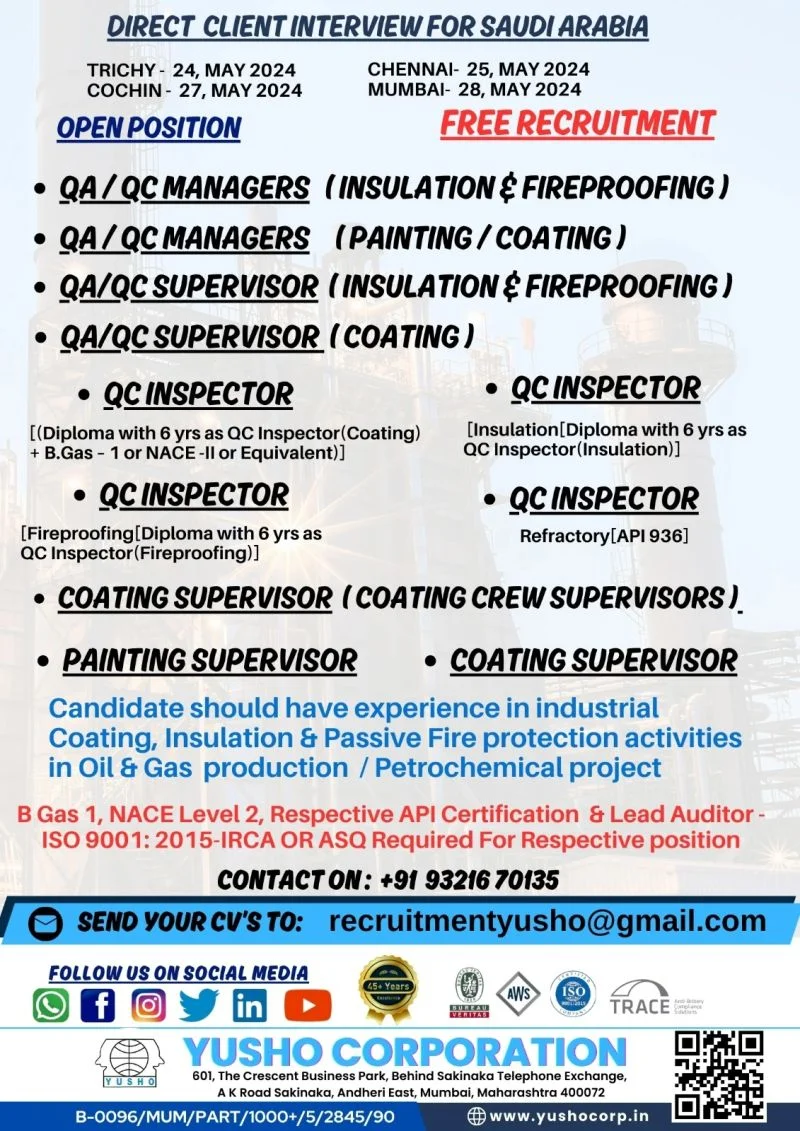 Qatar Shutdown Jos – Interview At Chennai On 22.05.2024 – Free Recruitment