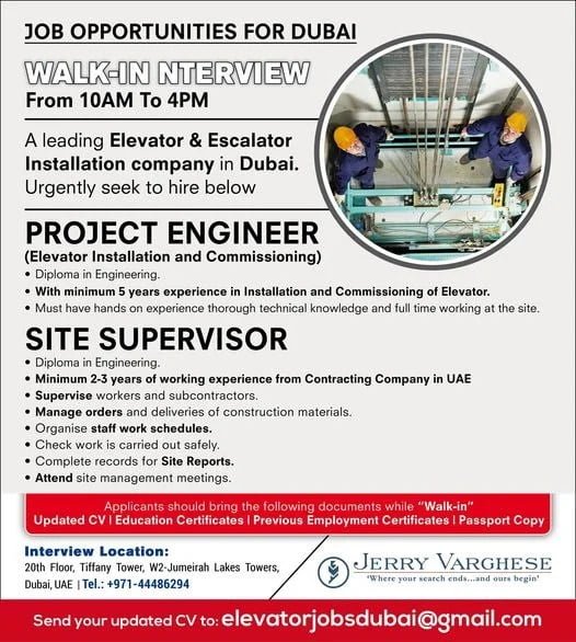 Gulf Job vacancyUrgent Job Opportunity For a Leading Elevator & Escalator Installation company in DubaiBy Assignment AbroadPublished on: April 28, 2024 ---Advertisement--- Mail CV to: elevatorjobsdubai@gmail.comPositions : Project Engineer Site SupervisorRelated Posts:Assignment Abroad Times PDF Today Newspaper, 5 November 2025Urgent required for saudi arabiaURGENT REQUIREMENT FOR BIKE RIDERS IN DUBAI (UAE) ::…Urgent required for reputed company dubaiURGENT REQUIREMENT FOR BIKE RIDERS IN DUBAI (UAE) ::…URGENT REQUIREMENT FOR BADAR AL MULLA KUWAIT CLINT… Assignment Abroad Assignment Abroad times Gulf job vacancy