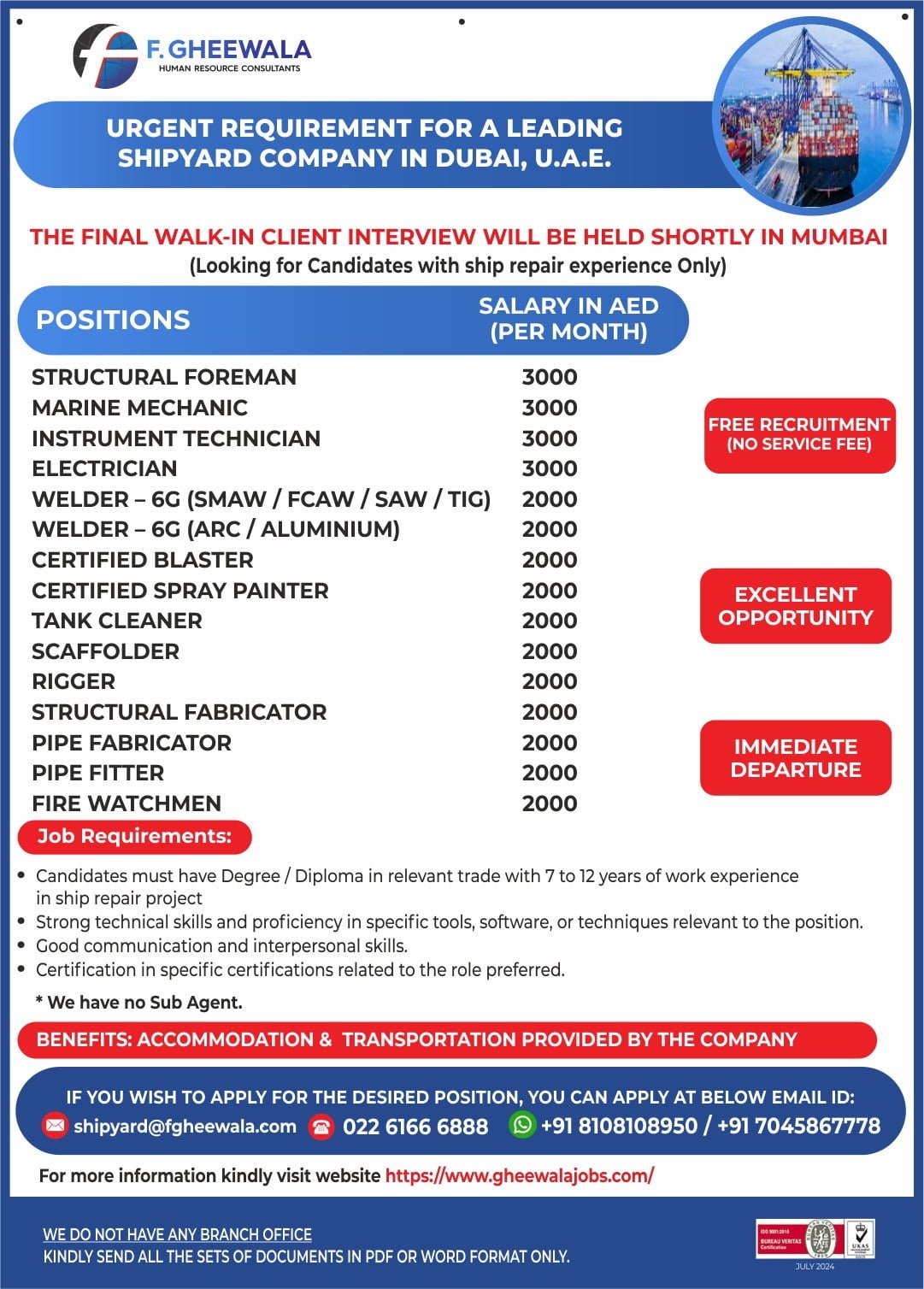 Overview: F. Gheewala Human Resource Consultants is conducting a final walk-in client interview in Mumbai for Urgent Recruitment for a Leading Shipyard Company in Dubai We are looking for candidates with ship repair experience only.