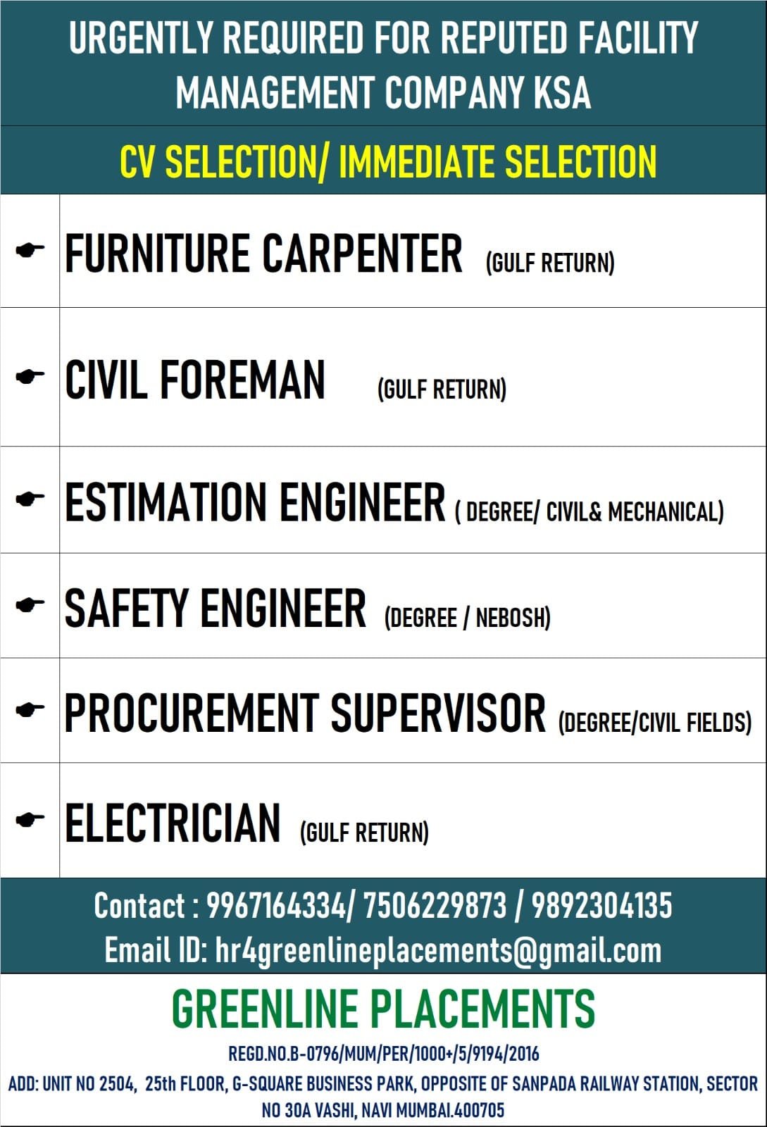 Gulf Job vacancyURGENT REQUIRED FOR REPUTED COMPANY KSABy Assignment AbroadPublished on: November 5, 2024 ---Advertisement---Contact : 9967164334 / 7506229873 / 9892304135 Email ID: hr4greenlineplacements@gmail.comRelated Posts:Urgently Required for Saudi Arabia Company – Online…Assignment Abroad Times 10th January 2026Urgent Requirement for DUBAI M/S EMIRATES COMPANY –…Urgent Requirement for DUBAI M/S FOURTH DIMENSION…Urgent Requirement for DUBAI M/S ALEMCO COMPANY –…URGENTLY REQD. FOR REPUTED COMPANY Abroad times Assignment Abroad Assignment Abroad times Fastnaukri.com Gulf job vacancy Overseas assignment