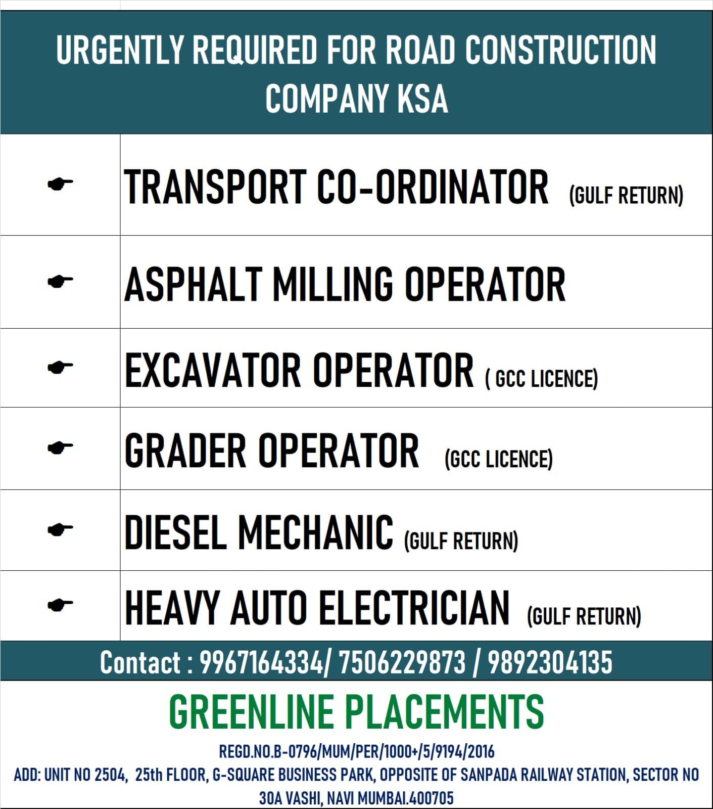 Contact : 9967164334 / 7506229873 / 9892304135 Email ID: hr4greenlineplacements@gmail.com