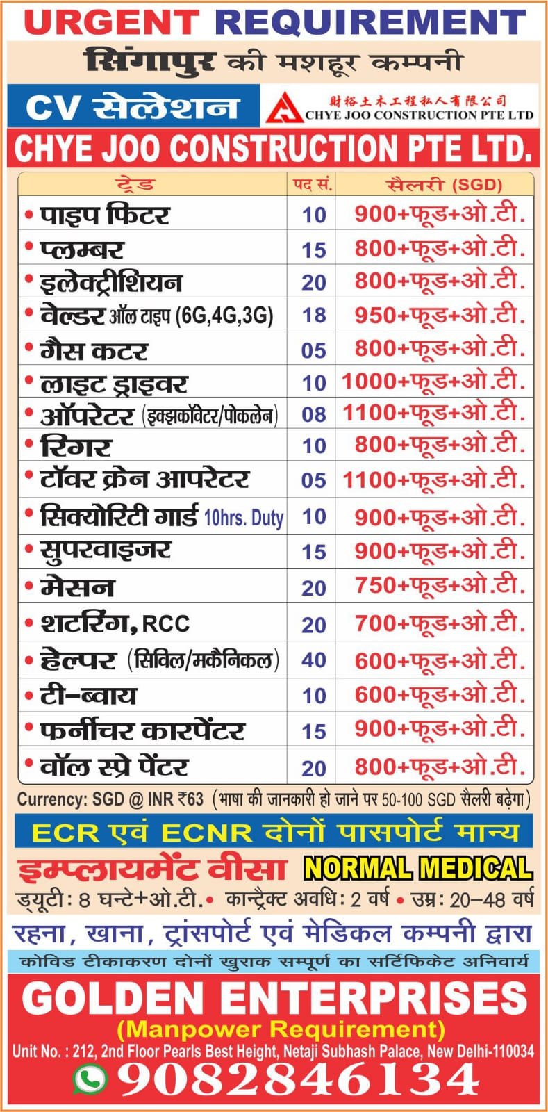 URGENT REQUIREMENTसिंगापुर की मशहूर कम्पनी Cv selection