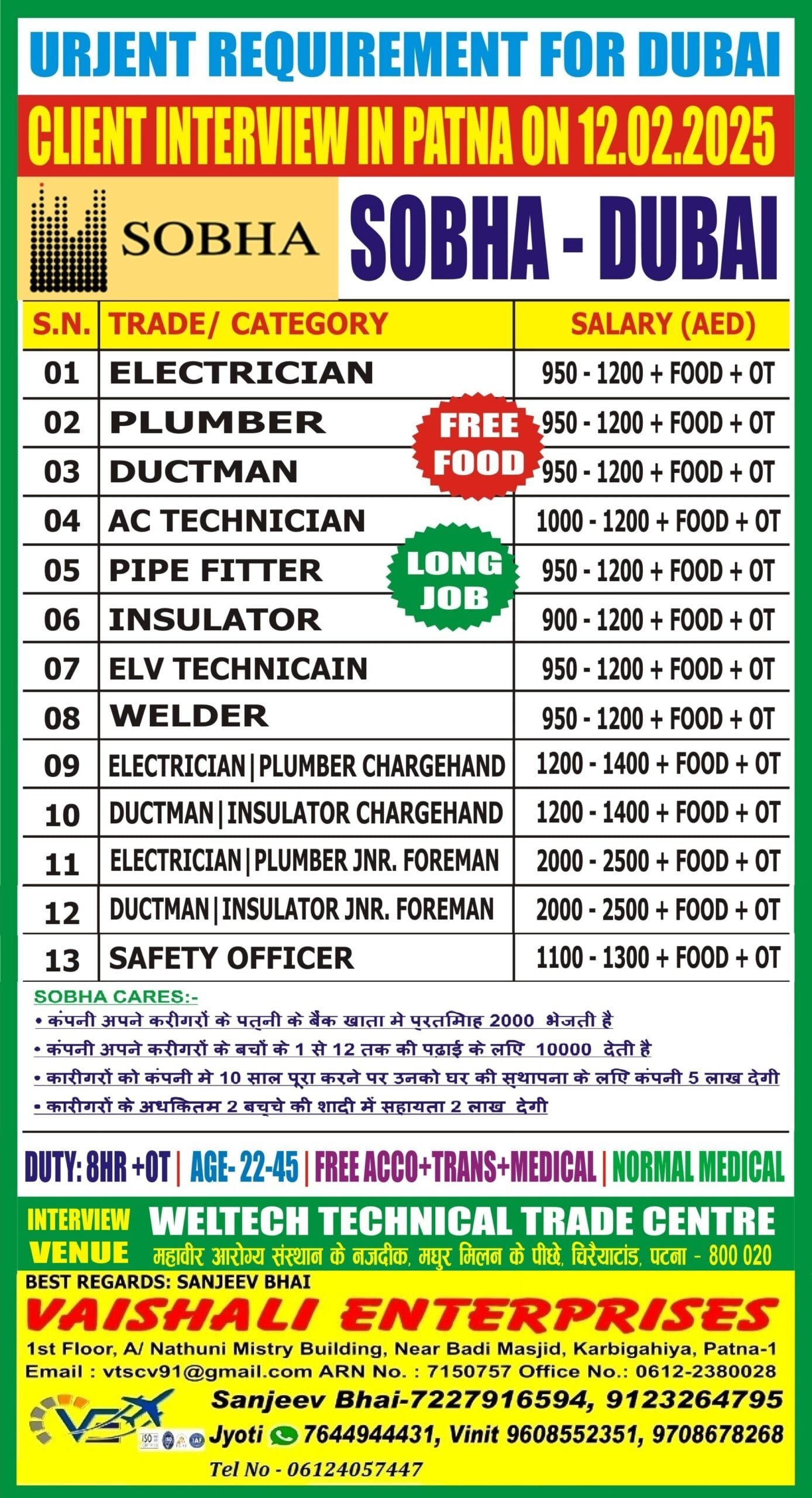 Urgent Requirement for DUBAI SOBHA COMPANY – Client Interview At PATNA ON 12TH FEB 2025