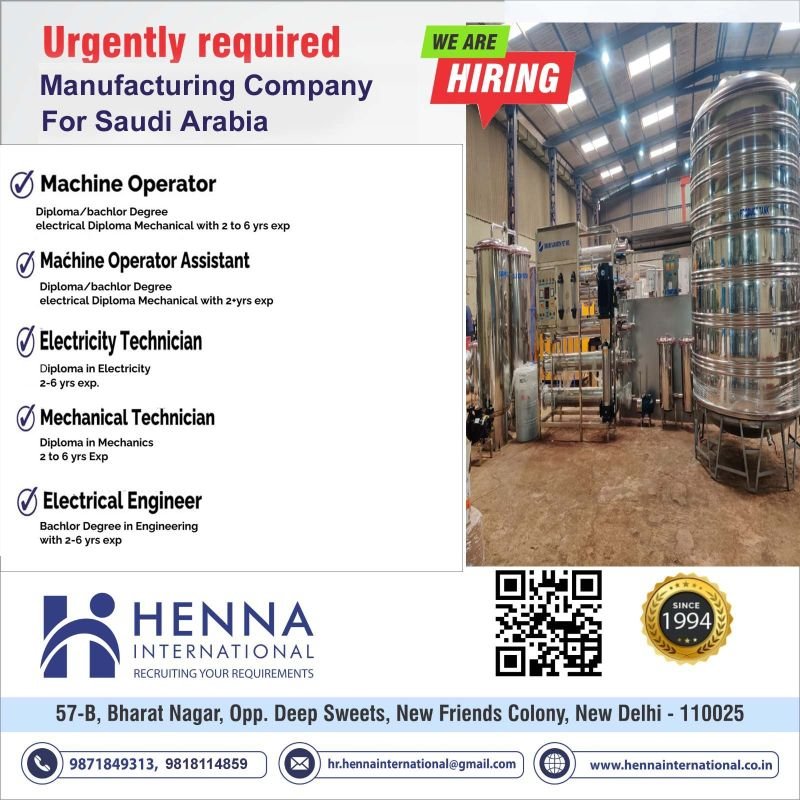 Assignment Abroad times, Urgent Requirement for Leading Manufacturing Company Saudi Arabia