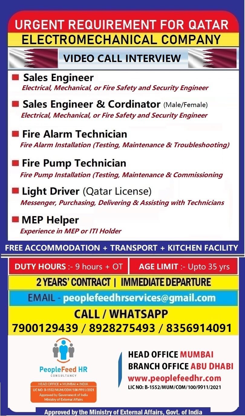 URGENT REQUIREMENT FOR REPUTED ELECTROMECHANICAL COMPANY ::-:: QATAR ::-:: VIDEO CALL INTERVIEW