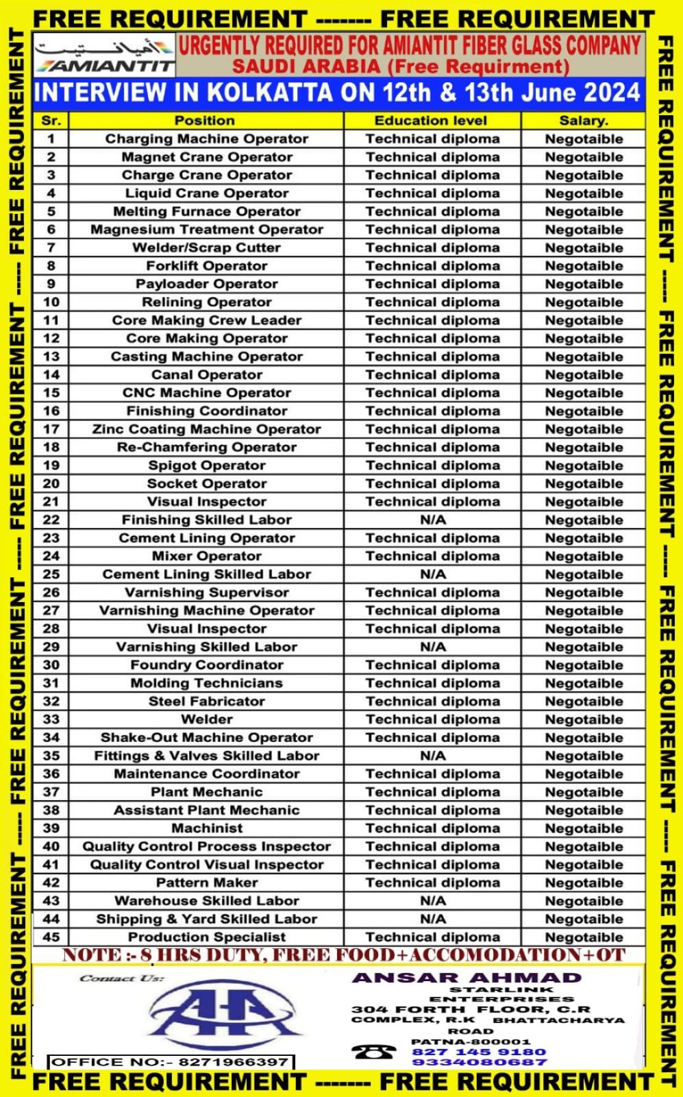 URGENTLY REQUIRED FOR AMIANTIT FIBER GLASS COMPANY SAUDI ARABIA (Free Requirment) INTERVIEW IN KOLKATTA ON 12th & 13th June 2024