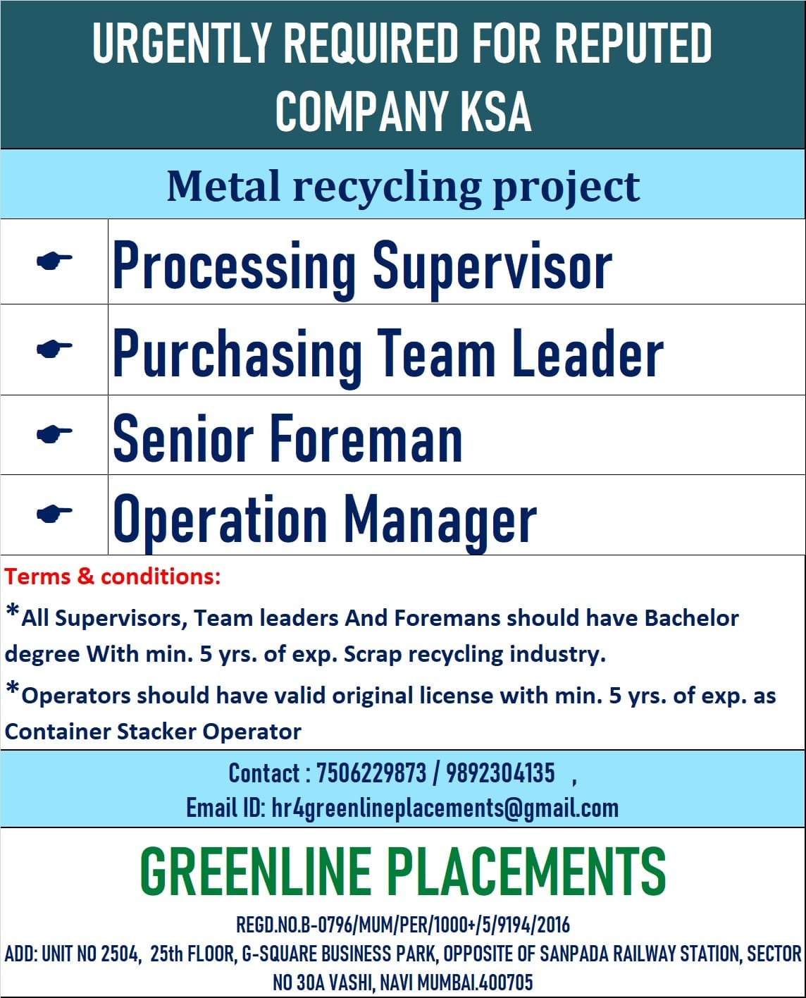 Gulf Job vacancyURGENTLY REQUIRED FOR REPUTED COMPANY KSABy Assignment AbroadPublished on: November 11, 2024 ---Advertisement---Contact : 9967164334 / 7506229873 / 9892304135 Email ID: hr4greenlineplacements@gmail.comRelated Posts:Assignment Abroad Times 10th January 2026Urgent Requirement for DUBAI M/S EMIRATES COMPANY –…Urgent Requirement for DUBAI M/S FOURTH DIMENSION…Urgent Requirement for DUBAI M/S ALEMCO COMPANY –…URGENTLY REQD. FOR REPUTED COMPANYURGENTLY REQD. FOR REPUTED COMPANY Abroad times Assignment Abroad Assignment Abroad times Fastnaukri.com Gulf job vacancy Overseas assignment