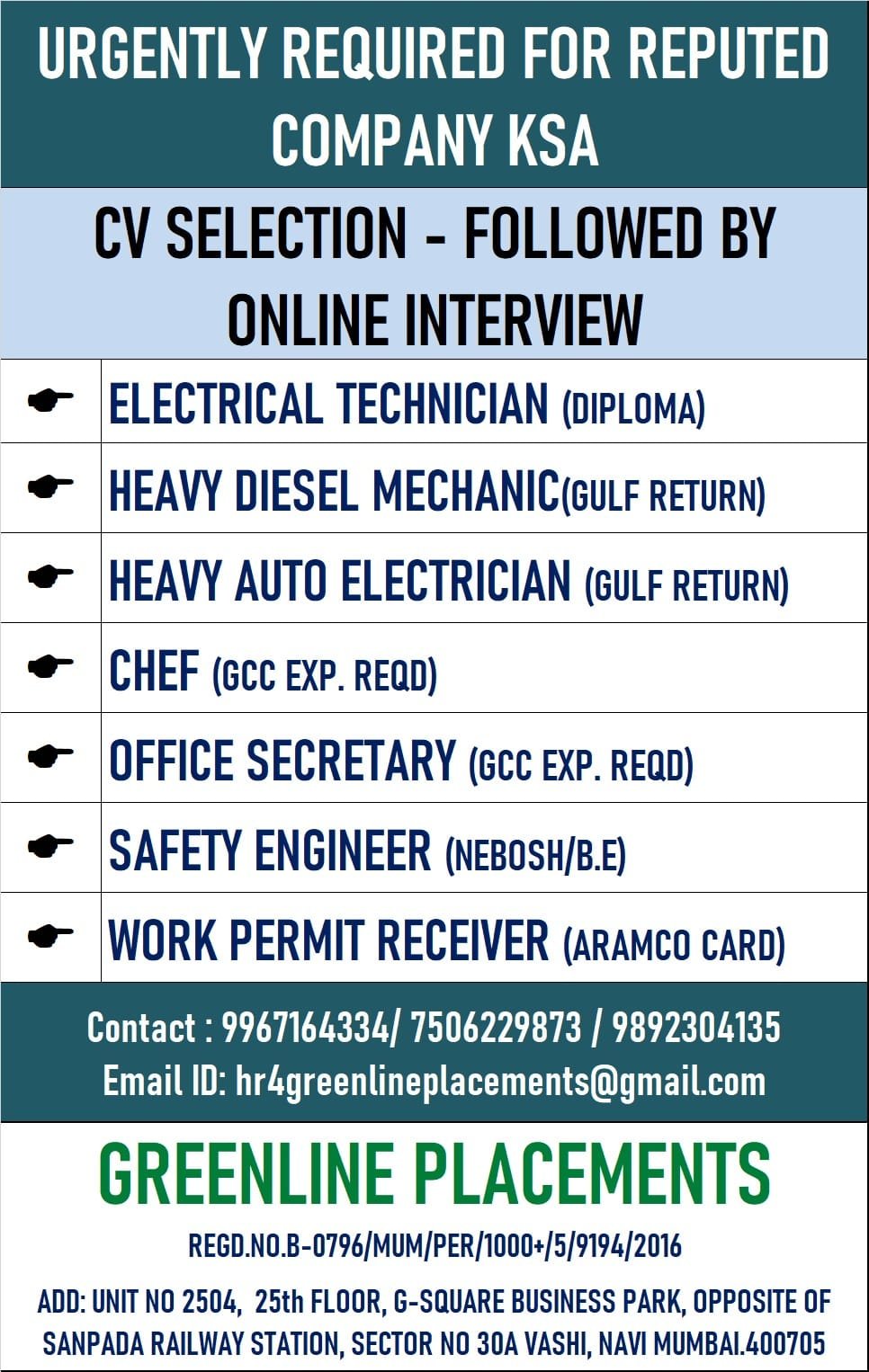 Gulf Job vacancyURGENTLY REQUIRED FOR REPUTED COMPANY KSABy Assignment AbroadPublished on: November 29, 2024 ---Advertisement---Contact : 9967164334/ 7506229873 / 9892304135 Email ID: hr4greenlineplacements@gmail.comRelated Posts:Urgently Required for Saudi Arabia Company – Online…Assignment Abroad Times 10th January 2026Urgent Requirement for DUBAI M/S EMIRATES COMPANY –…Urgent Requirement for DUBAI M/S FOURTH DIMENSION…Urgent Requirement for DUBAI M/S ALEMCO COMPANY –…URGENTLY REQD. FOR REPUTED COMPANY Abroad times Assignment Abroad Assignment Abroad times assignment abroad times mumbai assignment abroad times paper assignment abroad times pdf assignment abroad times today assignment abroad times today pdf assignment abroad times today pdf download Fastnaukri.com Gulf job vacancy Overseas assignment