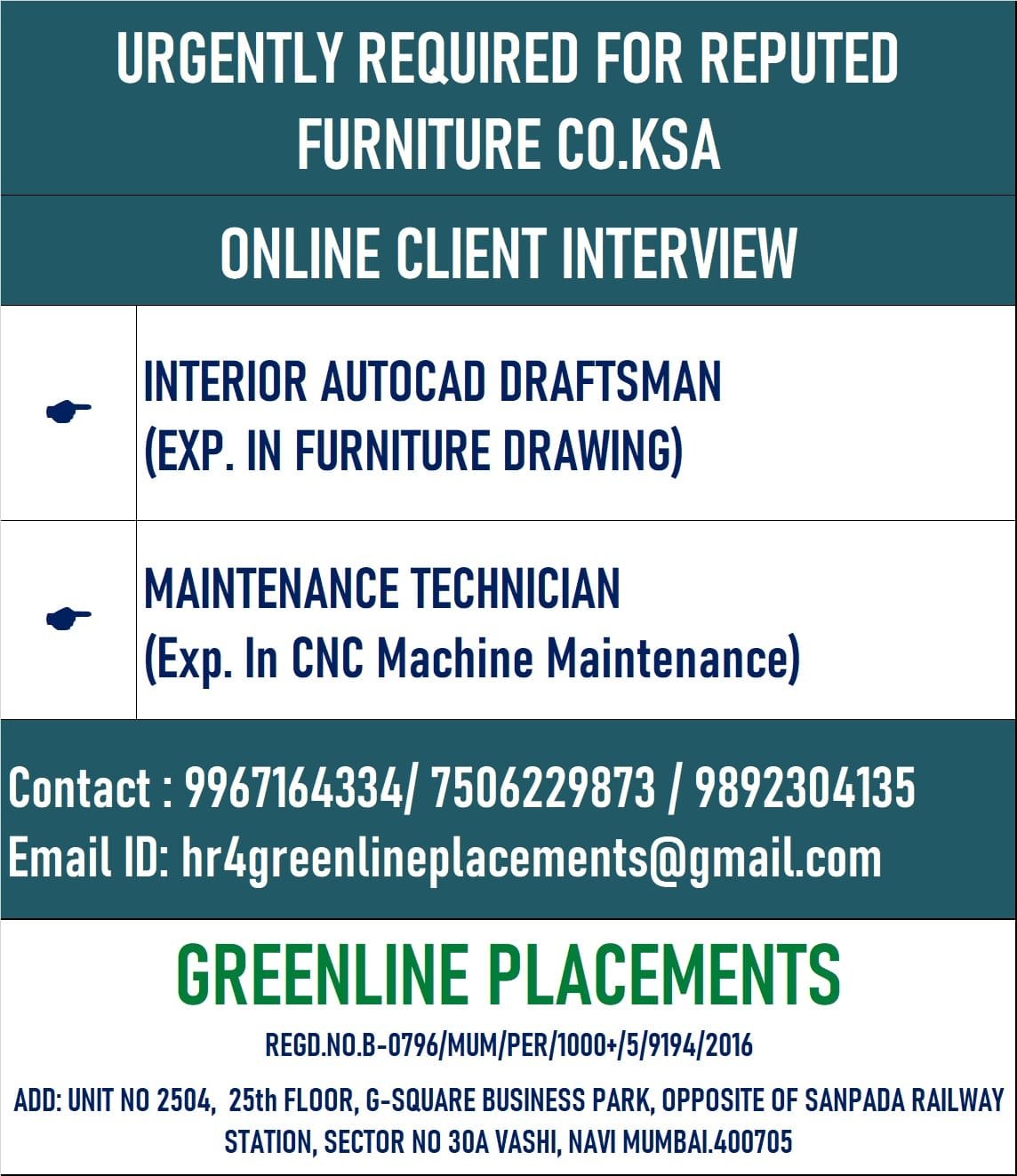 Contact : 9967164334 / 7506229873 / 9892304135 Email ID: hr4greenlineplacements@gmail.com