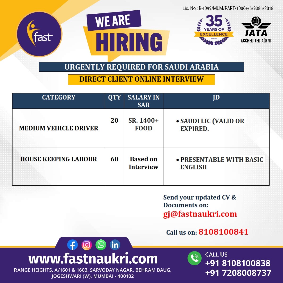 URGENTLY REQUIRED FOR SAUDI ARABIA