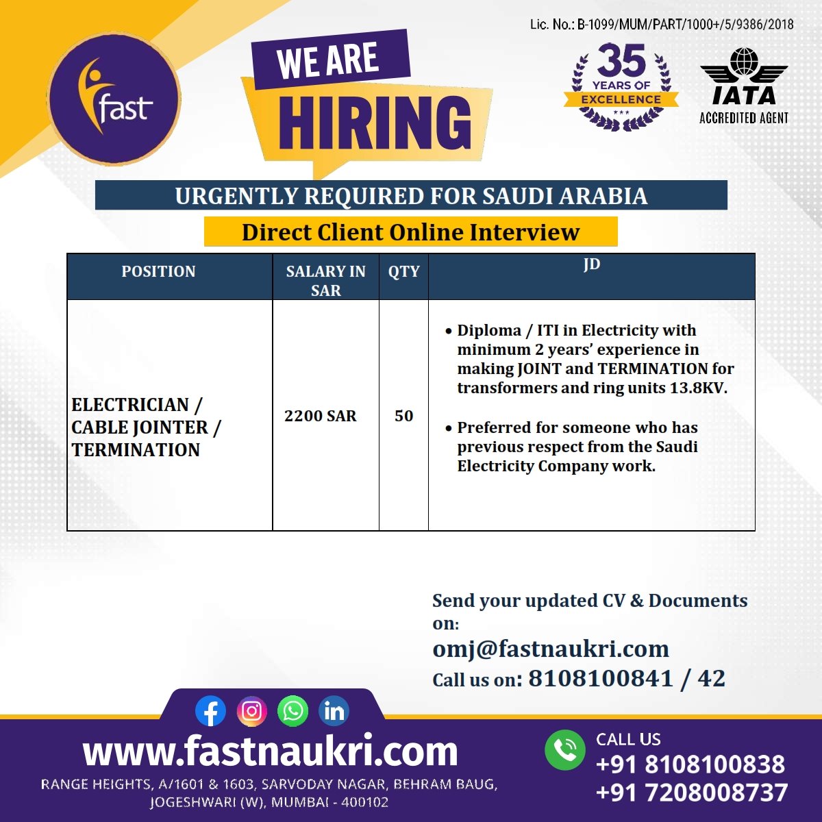Fastnaukri.com is currently hiring for multiple positions in Saudi Arabia. We are conducting direct client online interviews for qualified candidates.