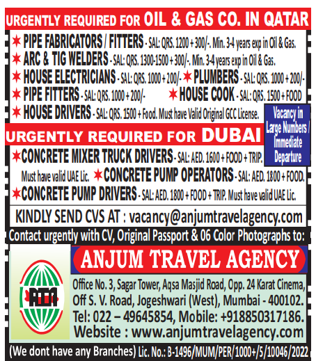 Anjum Travel Agency is seeking skilled professionals for Urgently required Oil & Gas Company in Qatar and Dubai This is an excellent opportunity for experienced candidates looking for immediate departure and attractive salary packages.